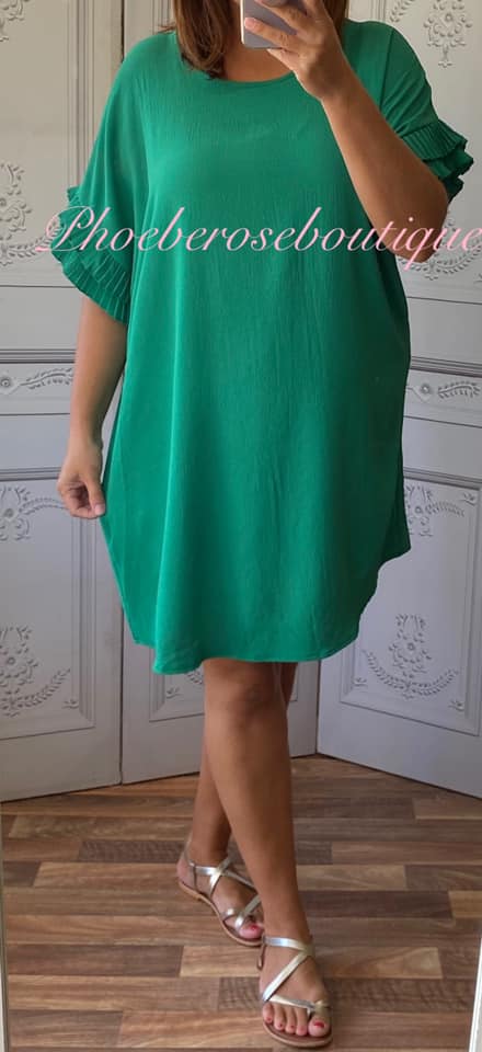 Crepe Feel Frill Arm Loose Fit Dress - Green