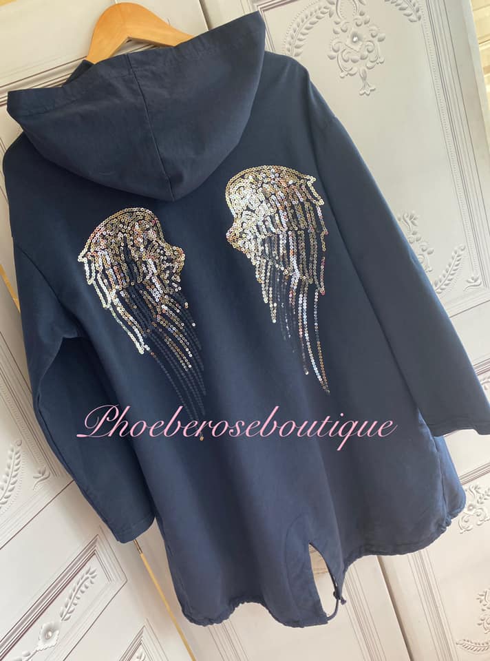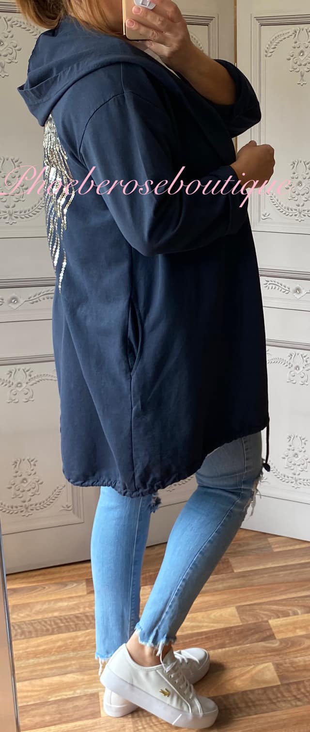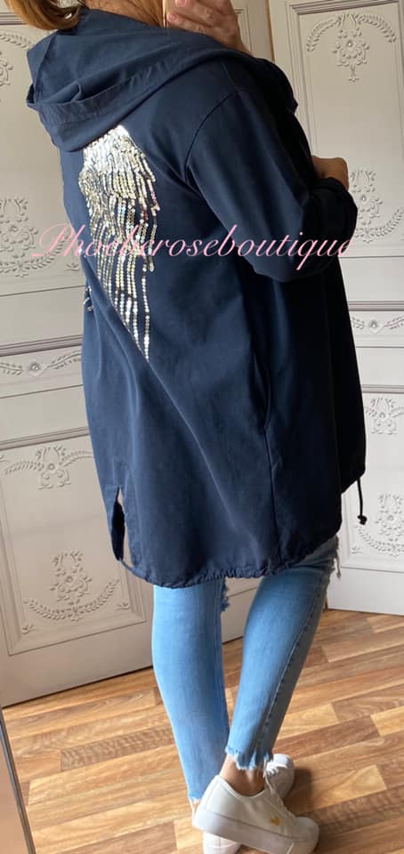 Angel Wing Sequin Back Soft Jersey Hooded Jacket – Navy
