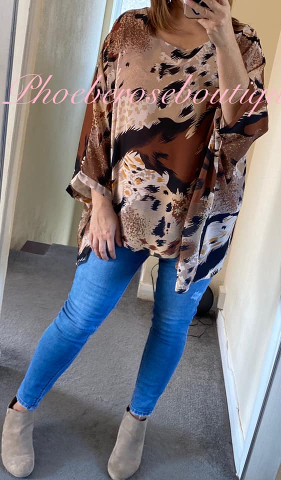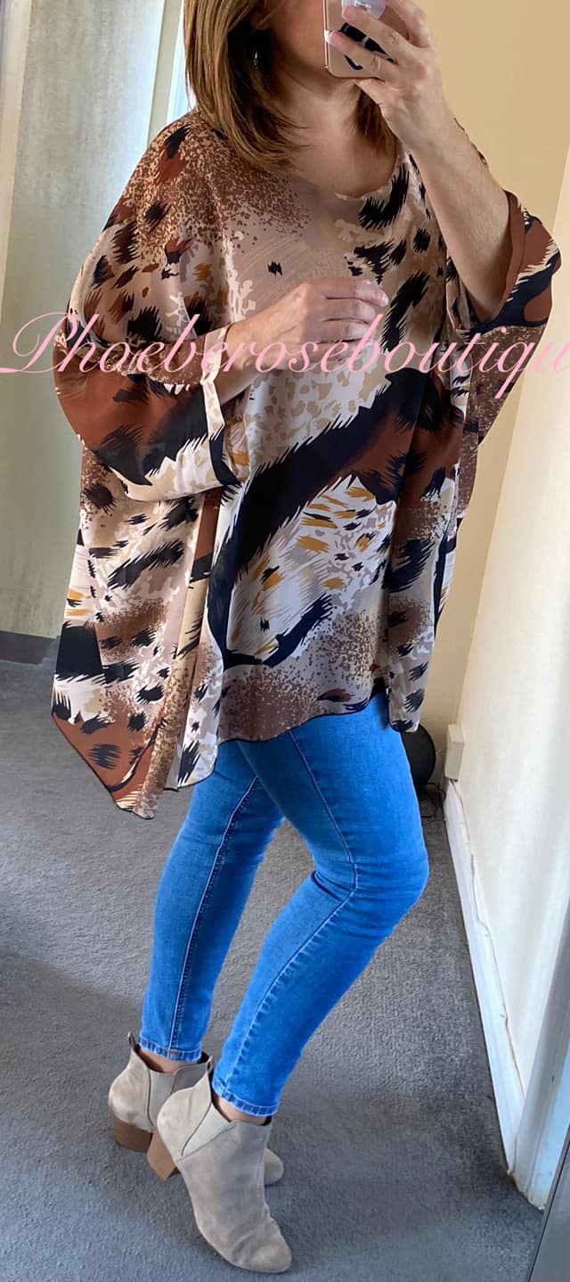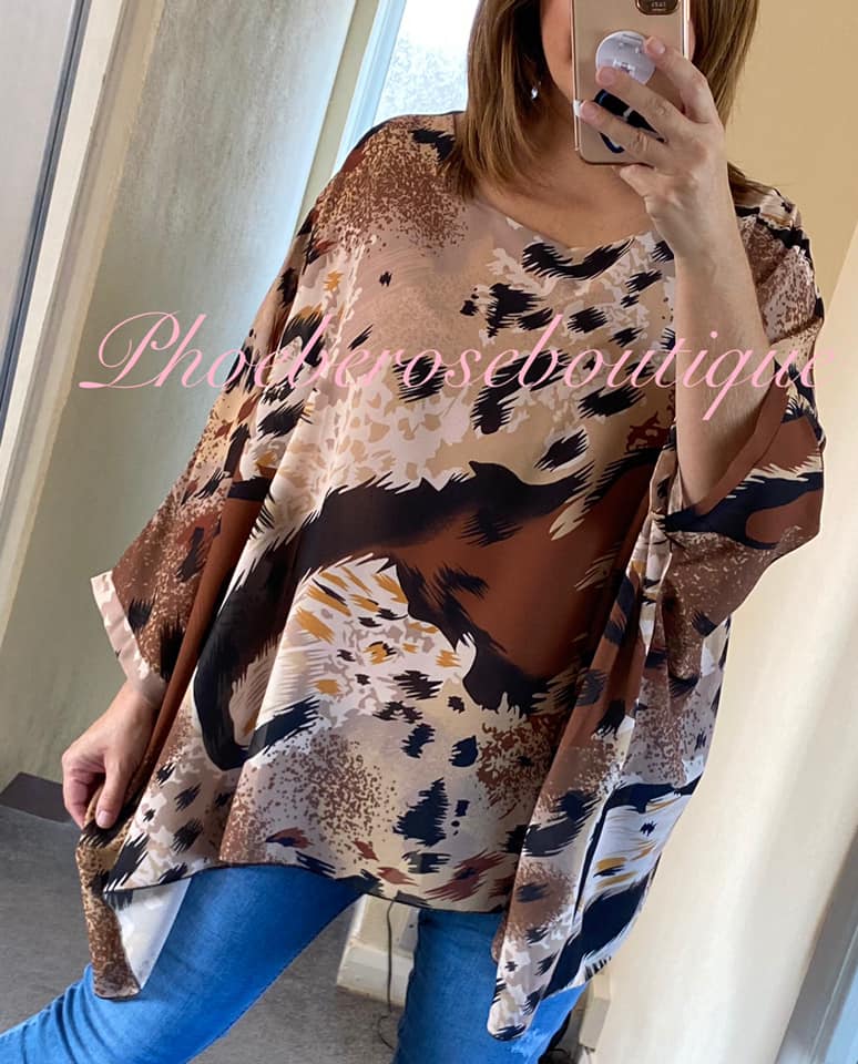 Animal Loose Fit Chiffon Bat-wing Sleeve Top – Tan Mix