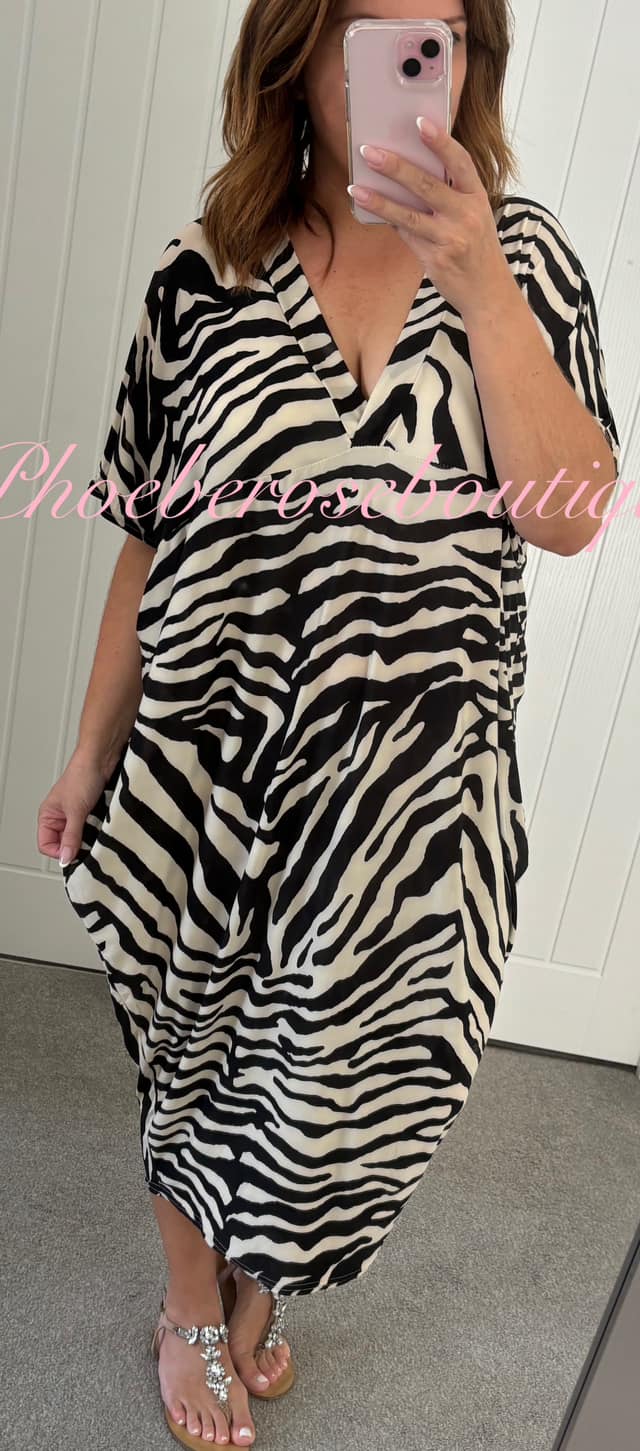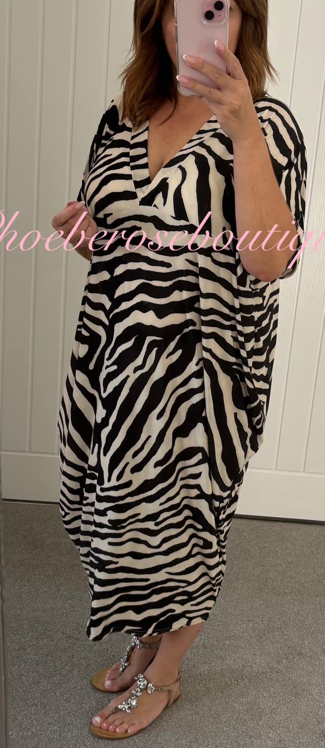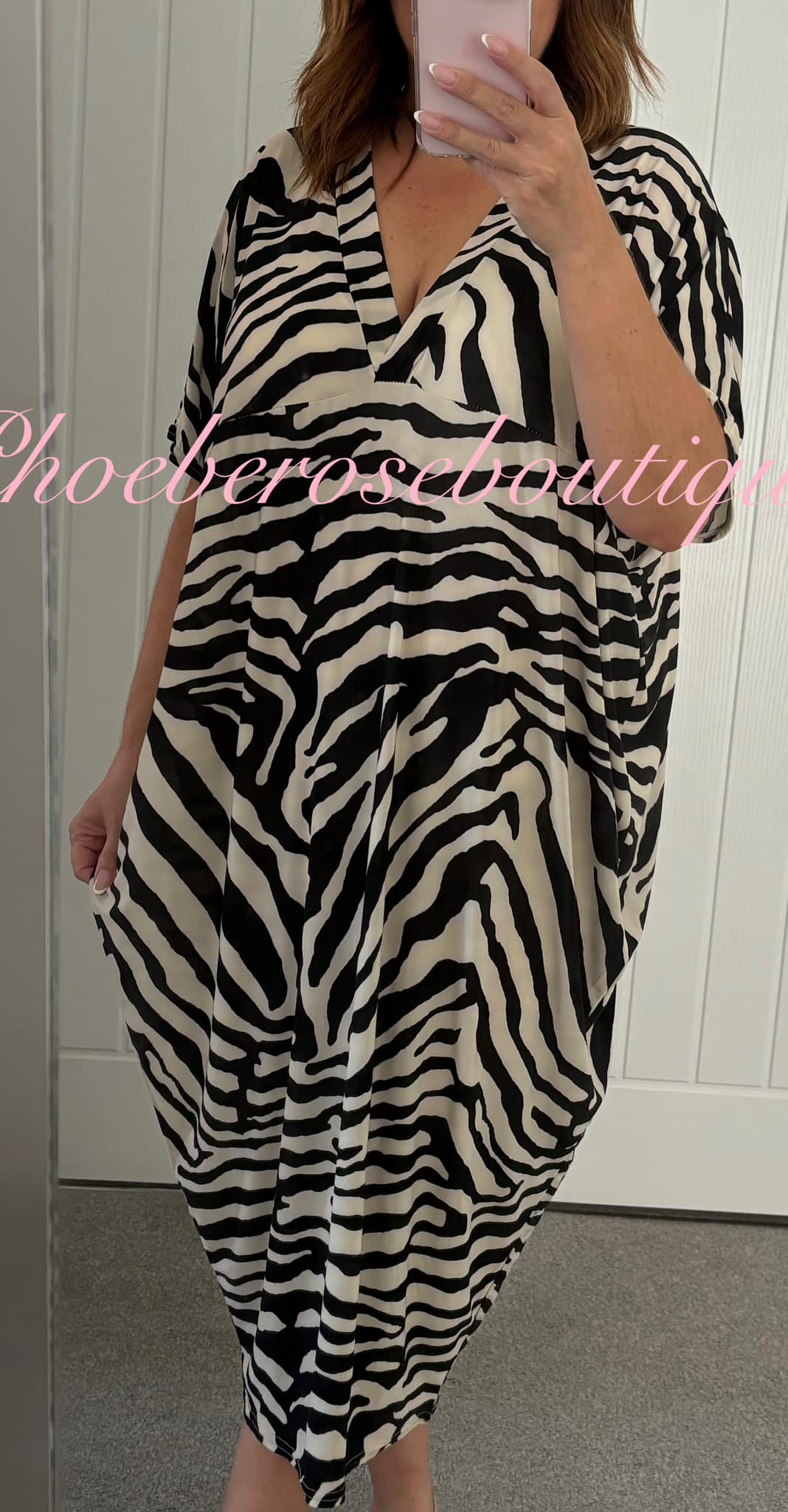 Super flattering shape dress v neck with seam under bust, bat wing style sleeves and drape loose fit pencil style skirt – Soft silky feel stretch jersey – One size fts up to a 16 – So comfy! Will see you into Autumn