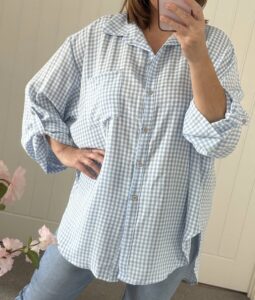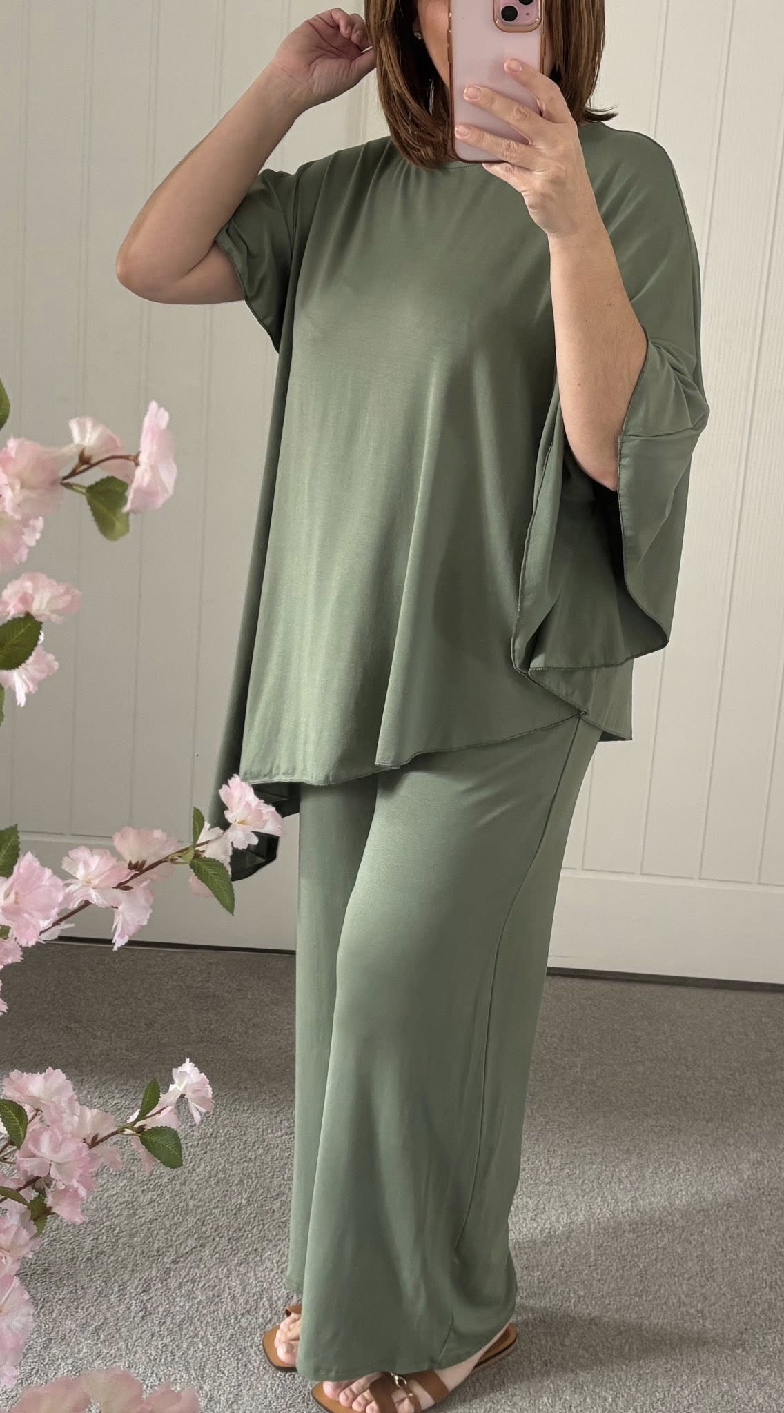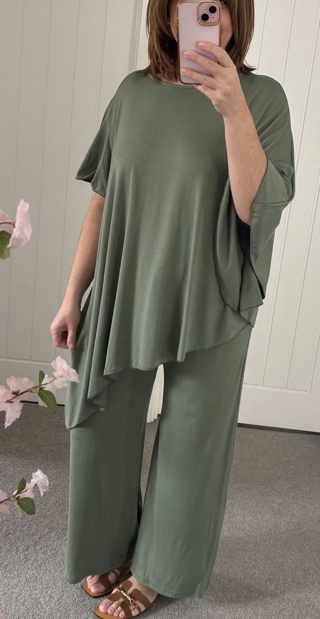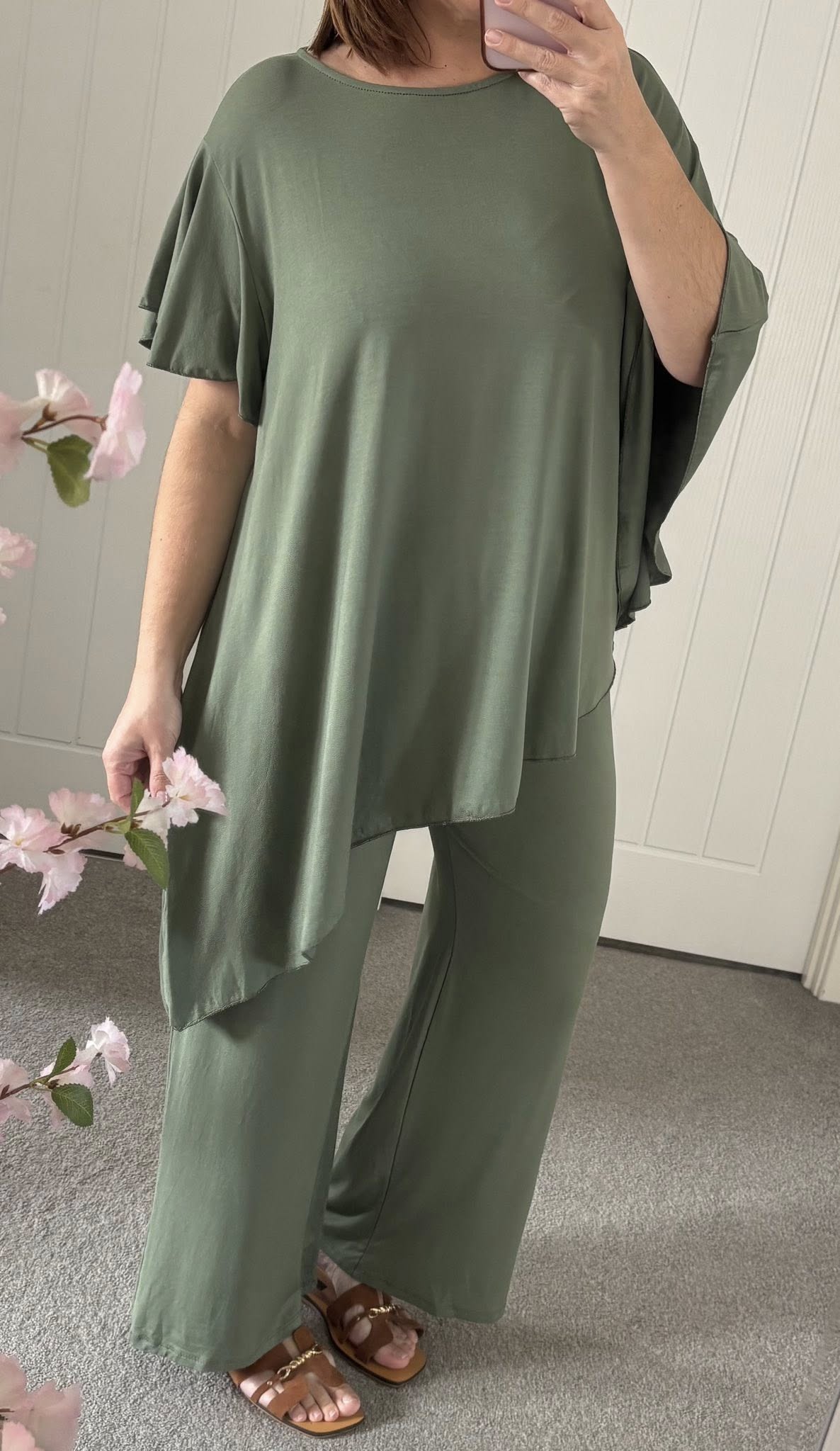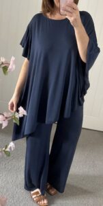 Butter soft jersey 2 piece trouser suit – Loose fit tunic style top drape asymmetric hemline – Elasticated waist pull on wide leg trousers – One size fits up to an 18 – So easy to wear – so versatile