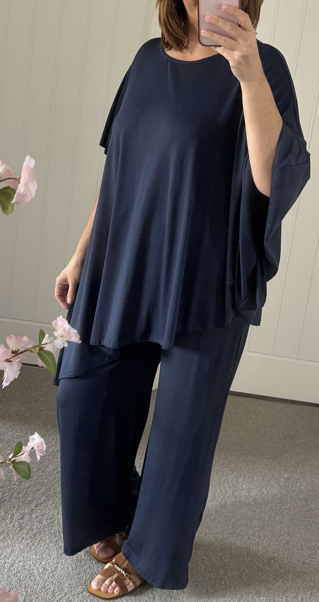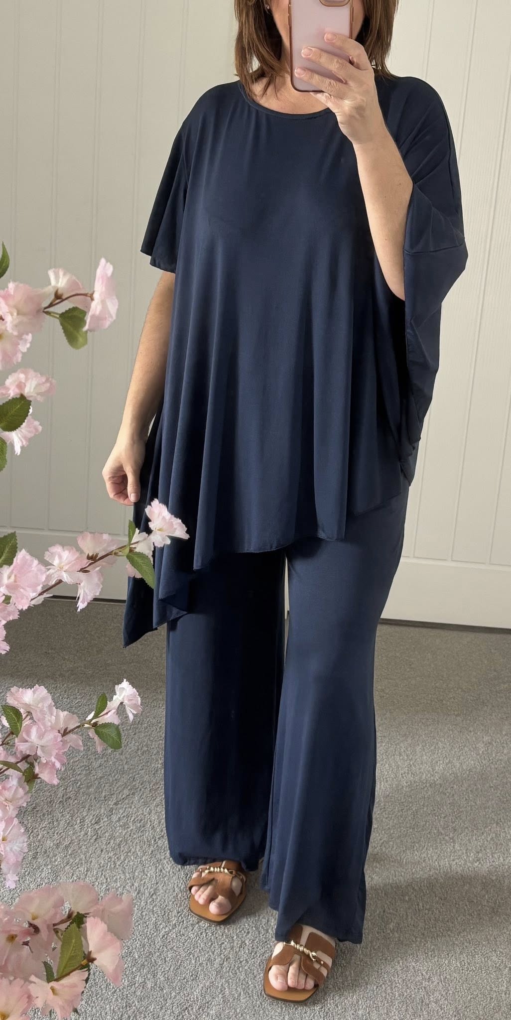 Butter soft jersey 2 piece trouser suit – Loose fit tunic style top drape asymmetric hemline – Elasticated waist pull on wide leg trousers – One size fits up to an 18 – So easy to wear – so versatile