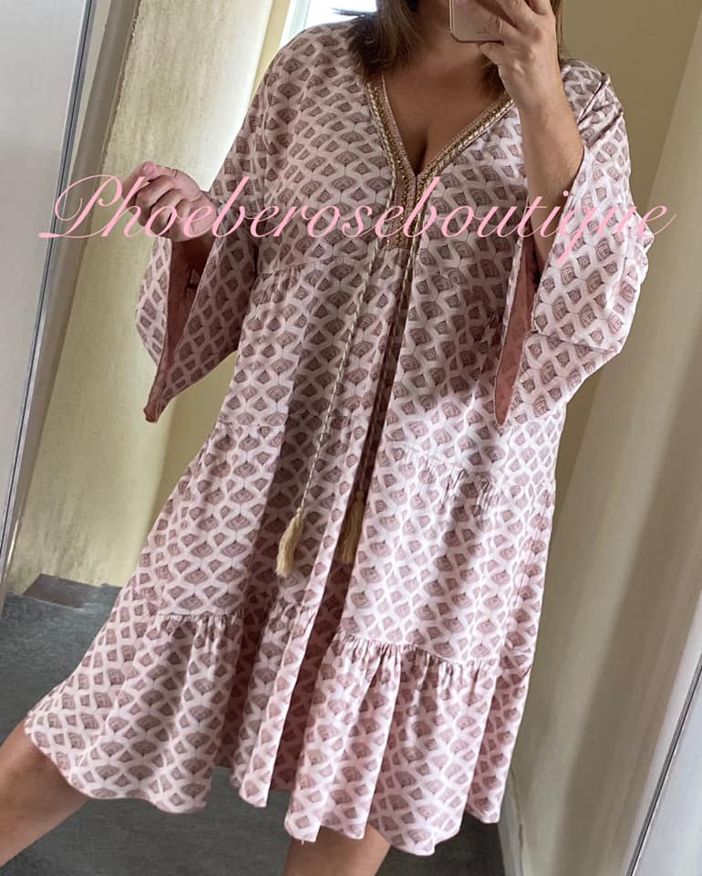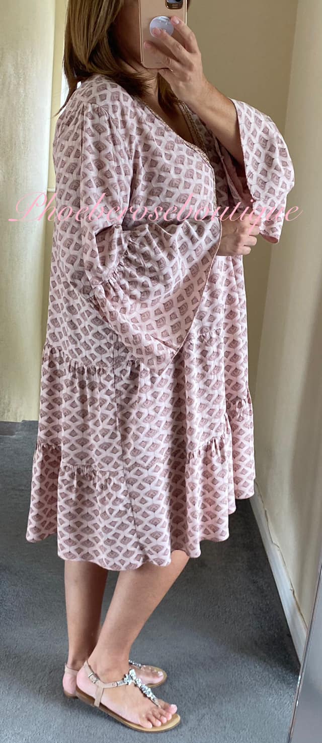 Boho Style Tiered Diamond print Tassel Dress/Tunic – Soft Pink