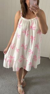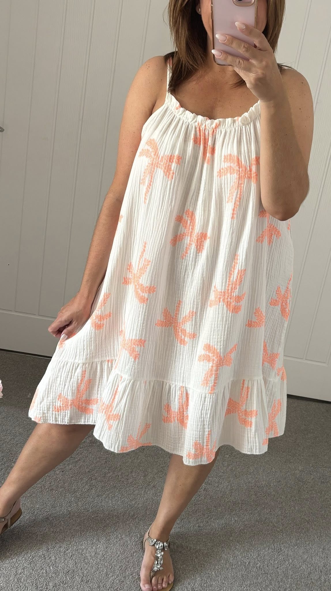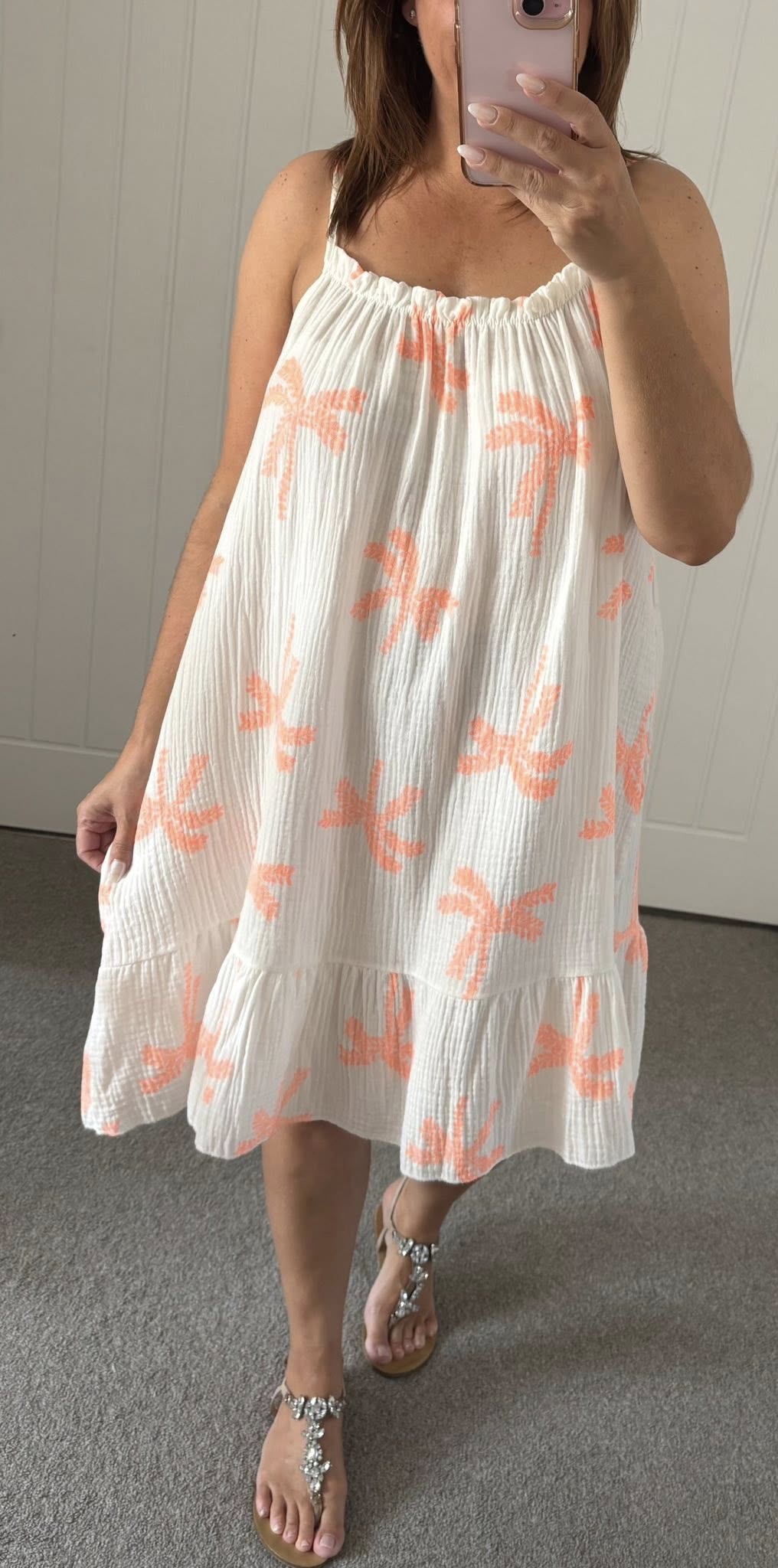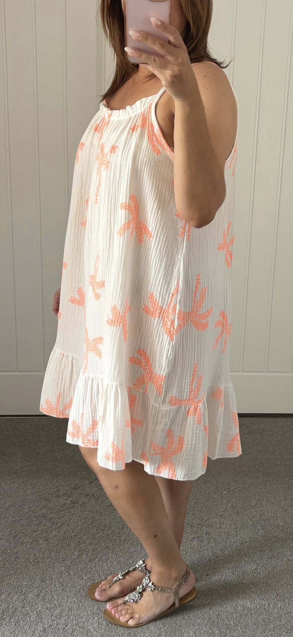 Gorgeous sundress in a soft cheesecloth fabric with an all over palm tree embroidered design – Frill hem and soft stretch elasticated neckline one size fits up to a good 16