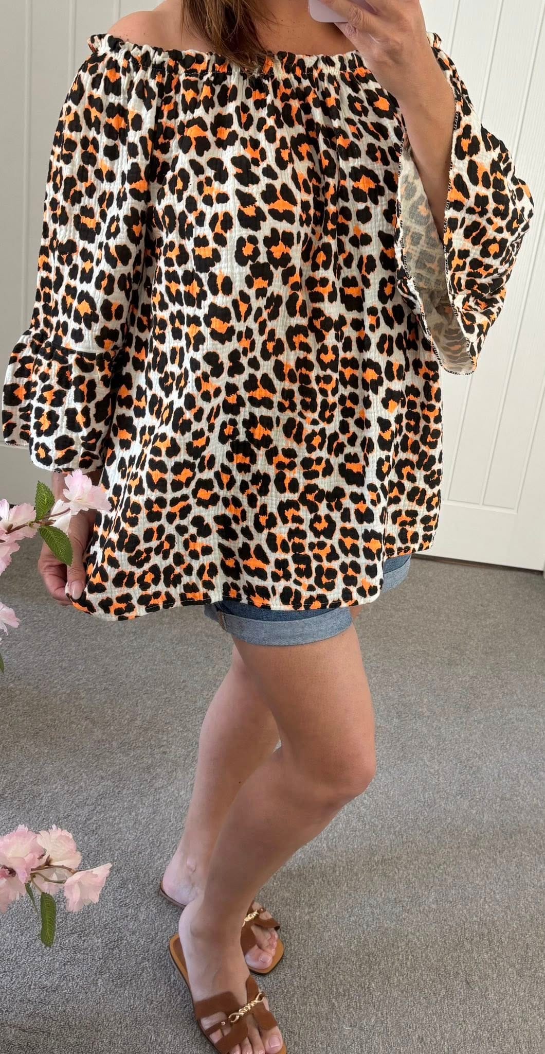 Be the first to review “Cheesecloth Lepo Print Flared Sleeve Bardot Top – Neon Orange”
