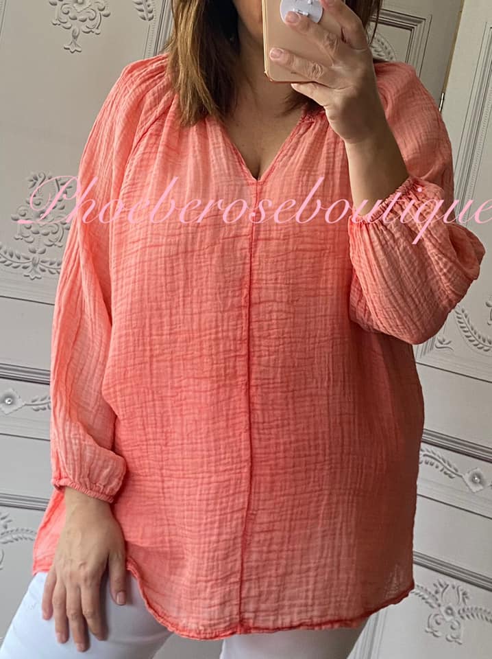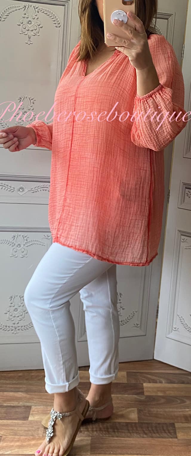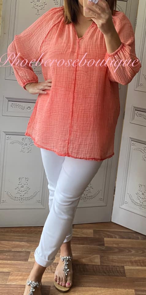 Cheesecloth Lightweight Ruched Neckline Top – Coral