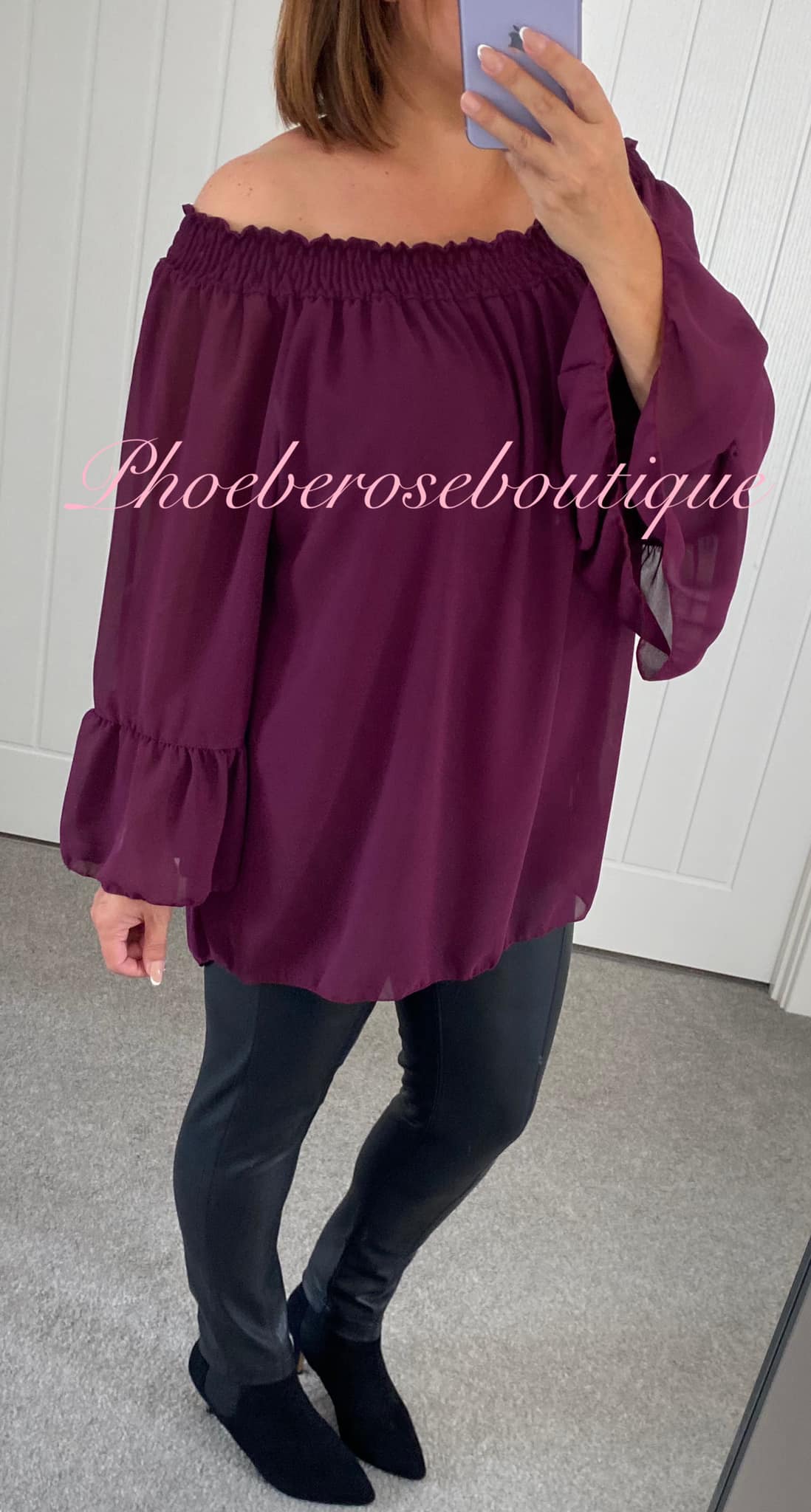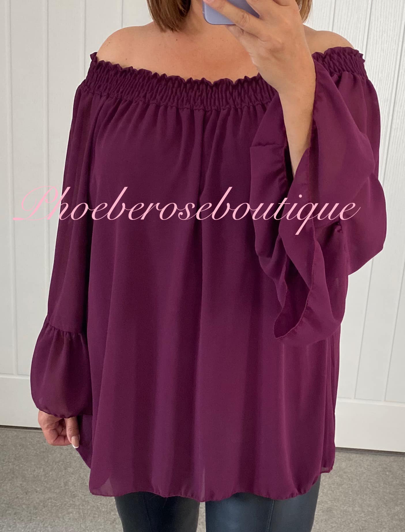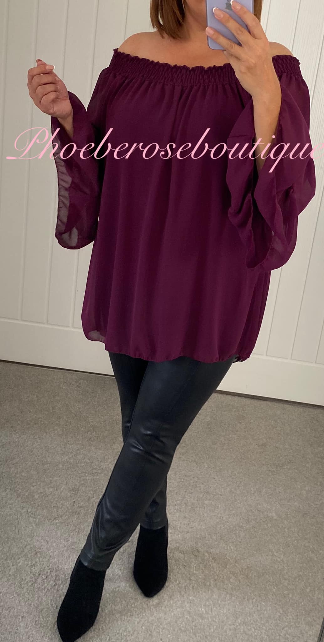 Chiffon Flared Sleeve Loose Fit Bardot Top – Plum