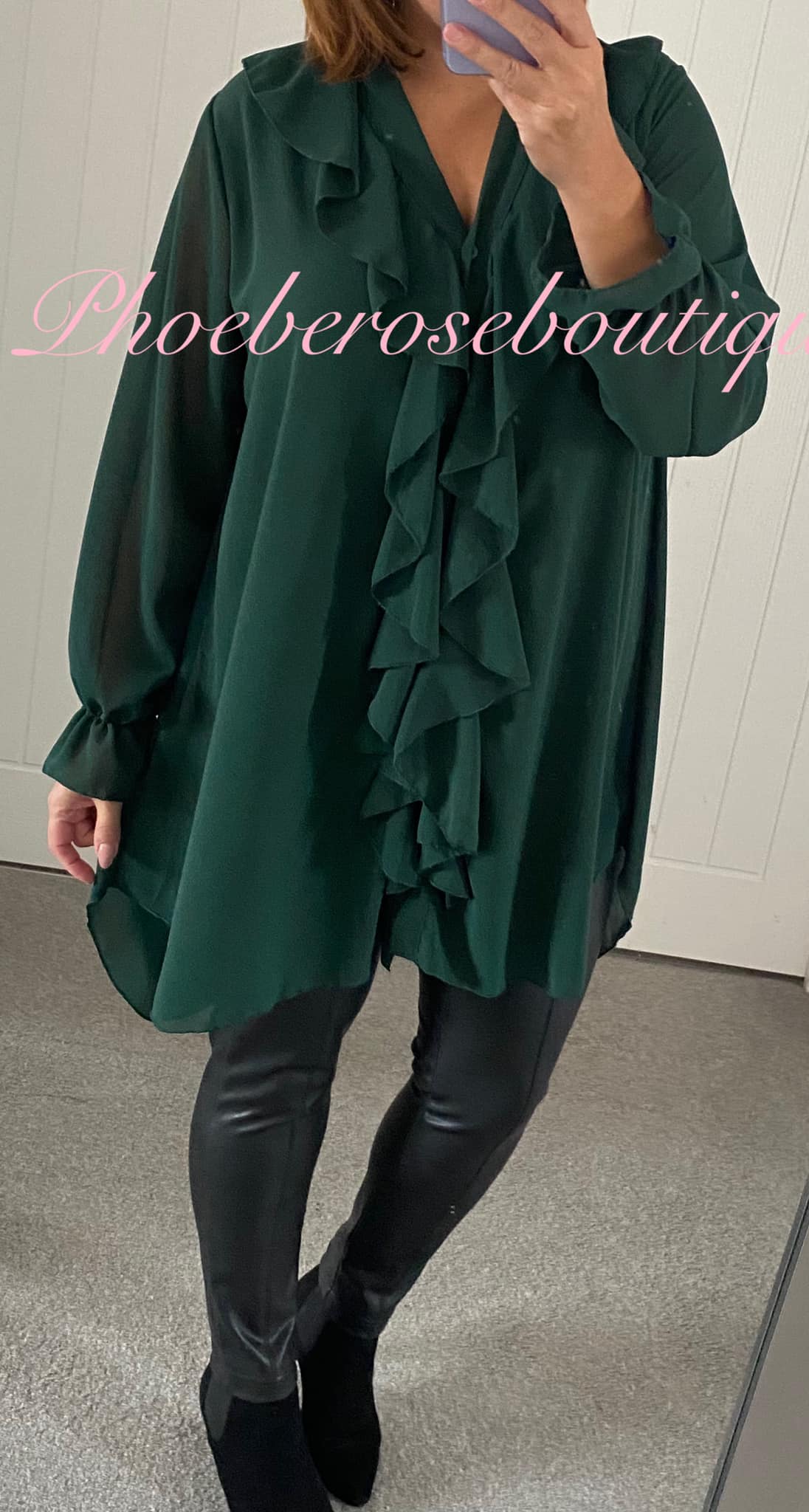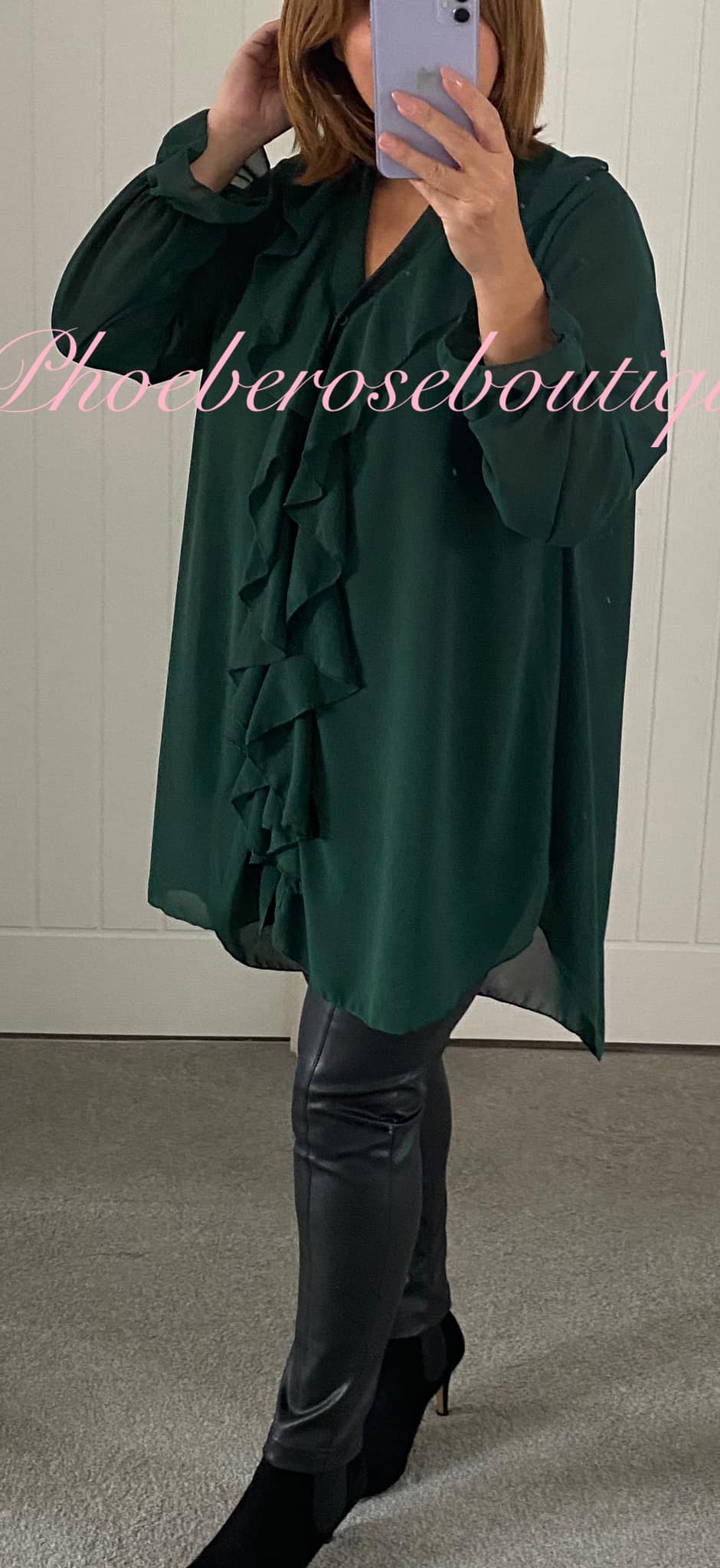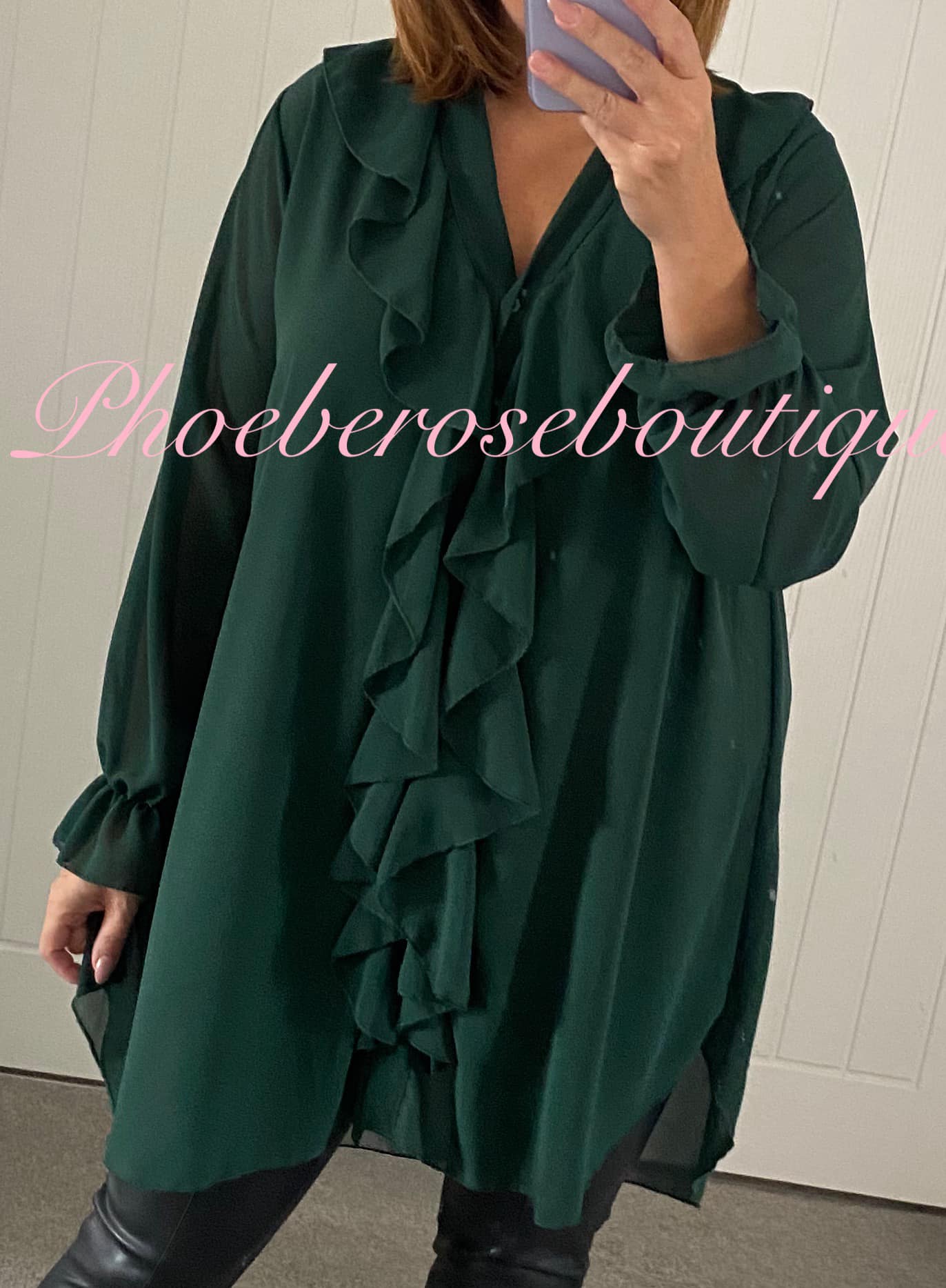 Chiffon Ruffle Front Oversized Shirt/Tunic – Dark Green