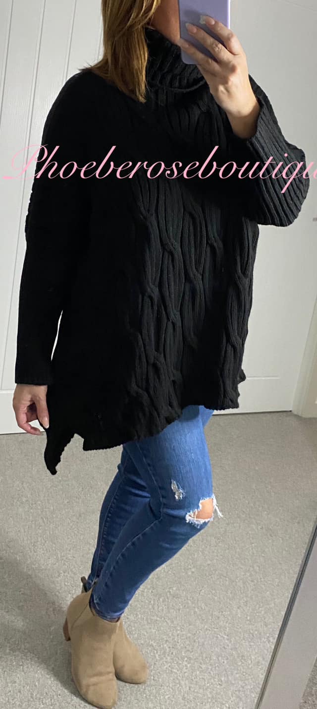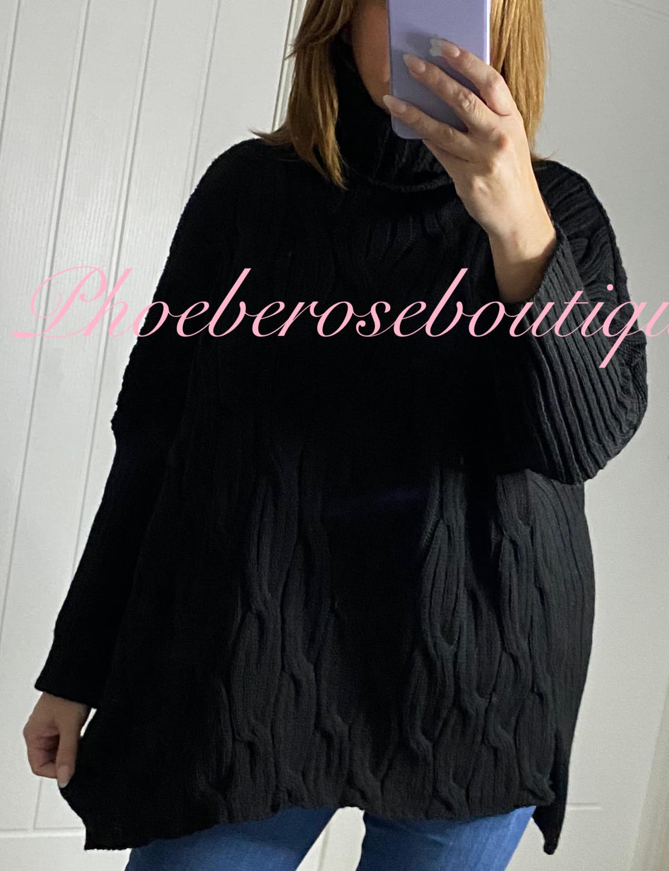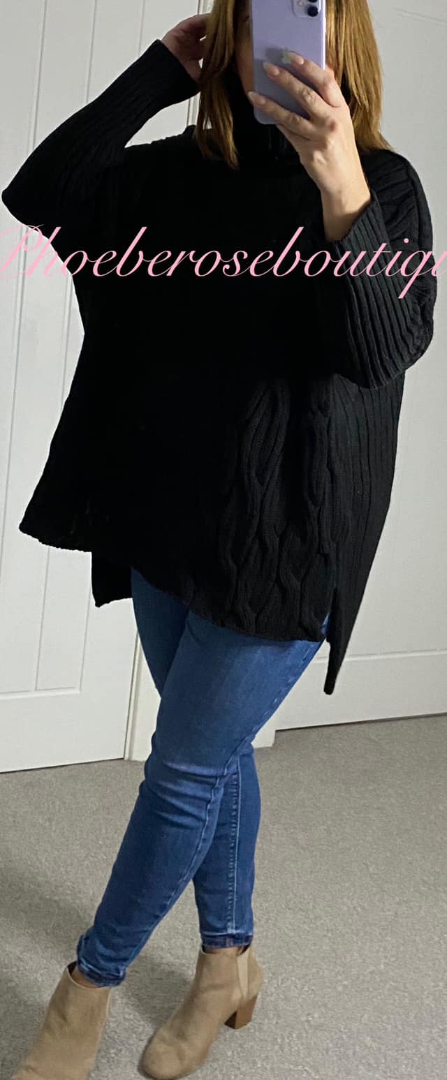 Chunky Cable Knit Roll Neck Hi/Low Oversized Jumper – Black