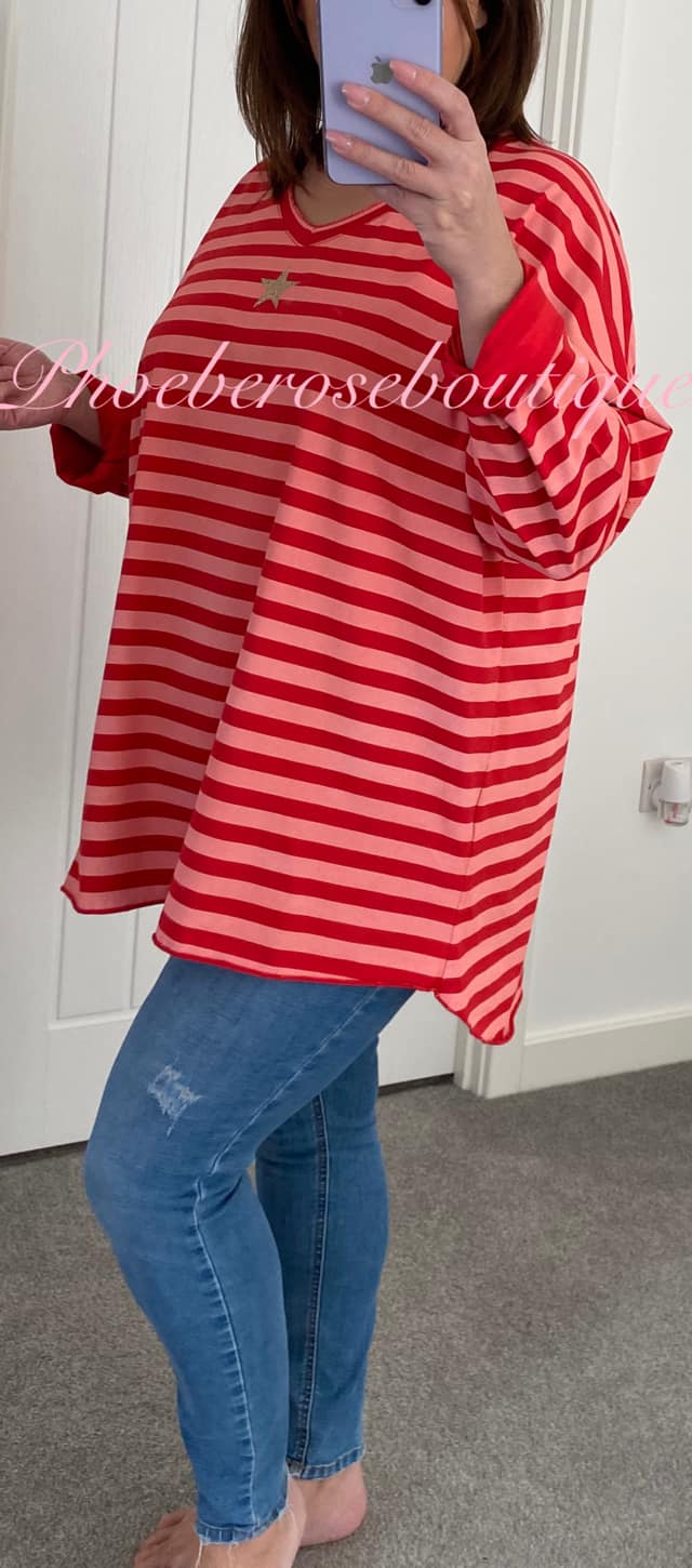 Contrast Stripe Glitter Star V Neck Loose Fit Top – Red