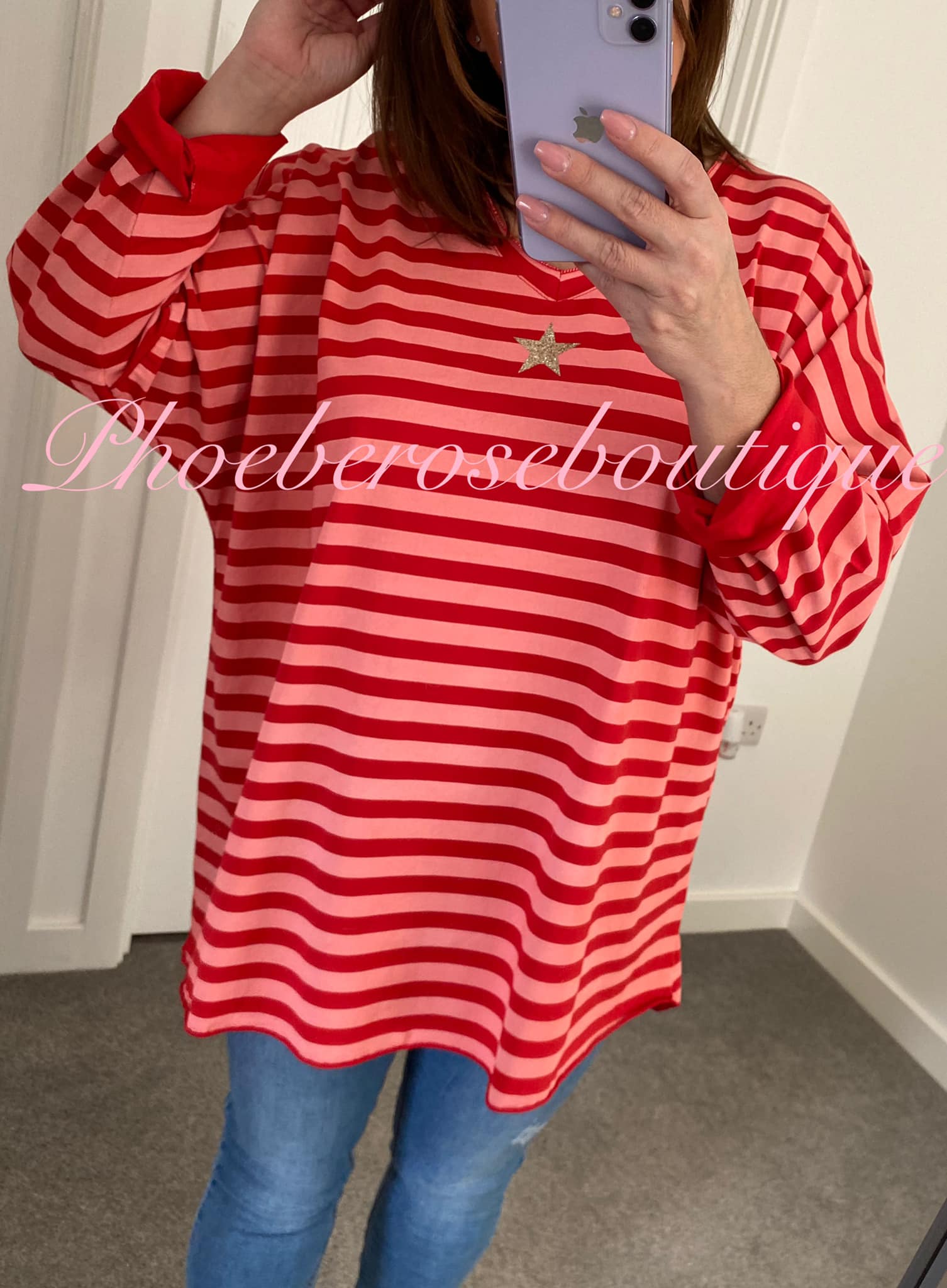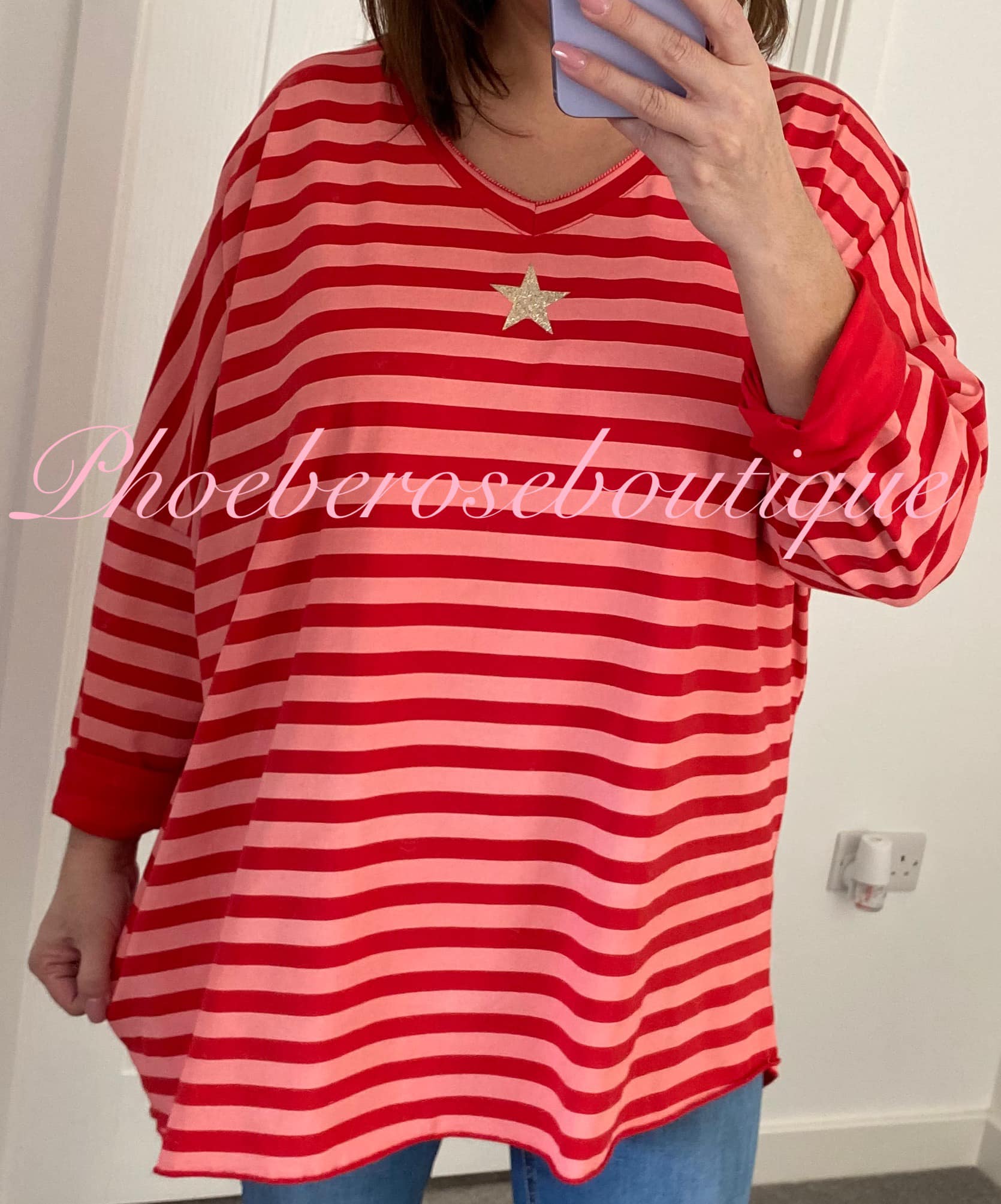 Be the first to review “Contrast Stripe Glitter Star V Neck Loose Fit Top – Red”