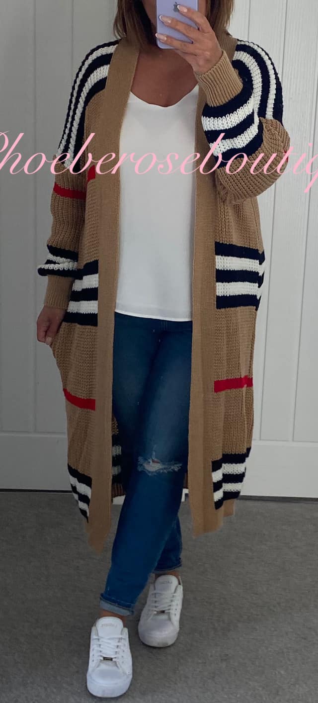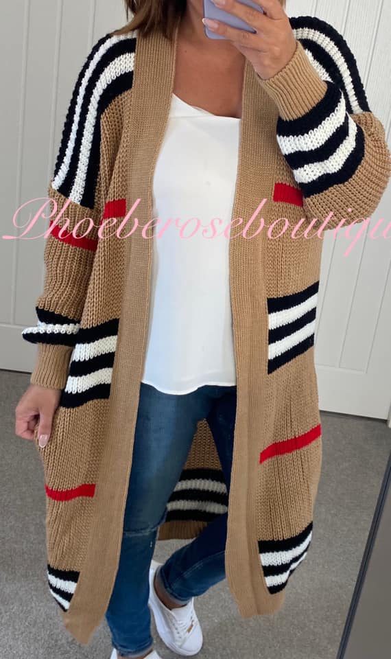 Contrast Stripe Longline Chunky Knit Cardigan – Camel