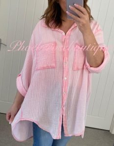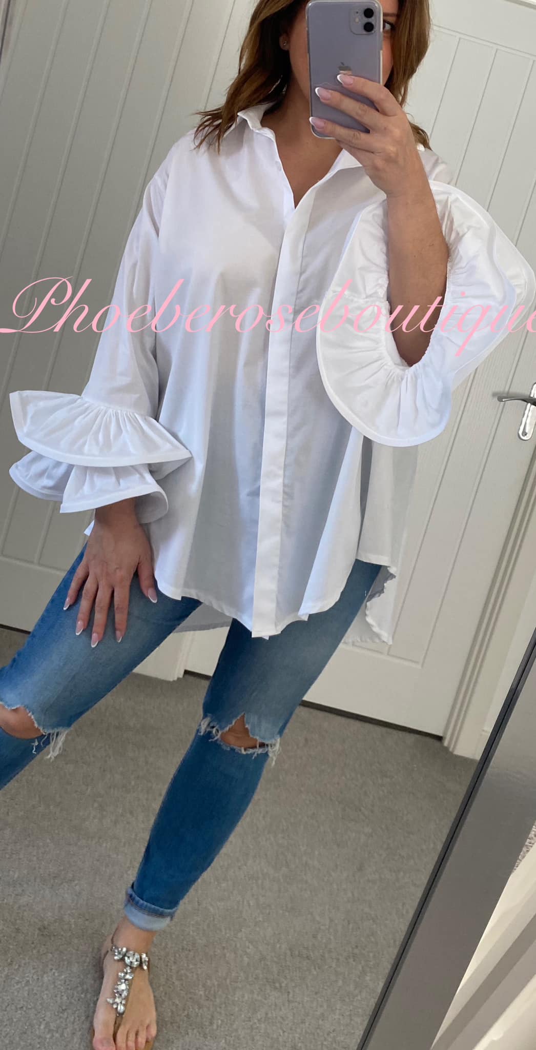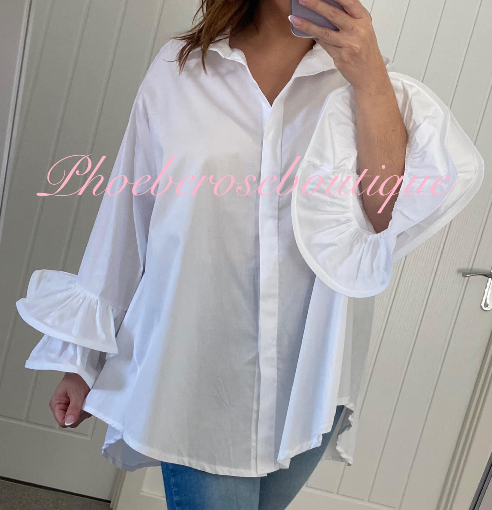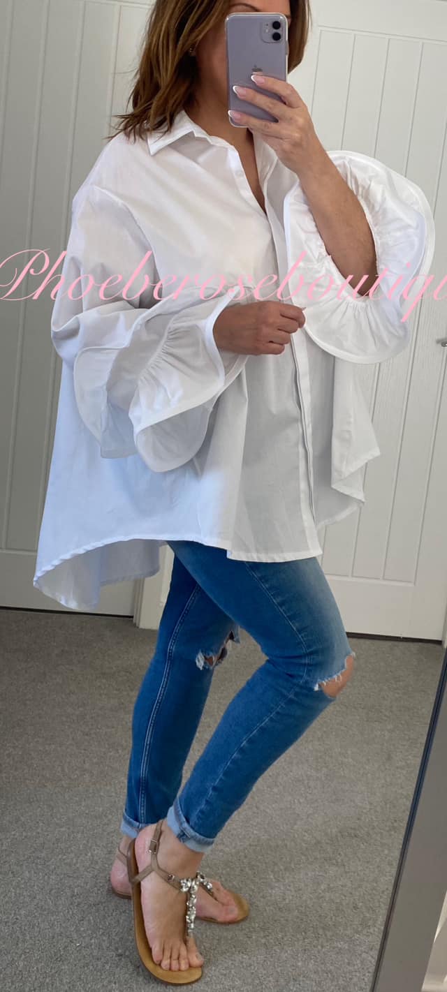 Stunning oversized shirt in a cotton/elastane mix – Gorgeous double frill sleeves – One size fits up to an 18