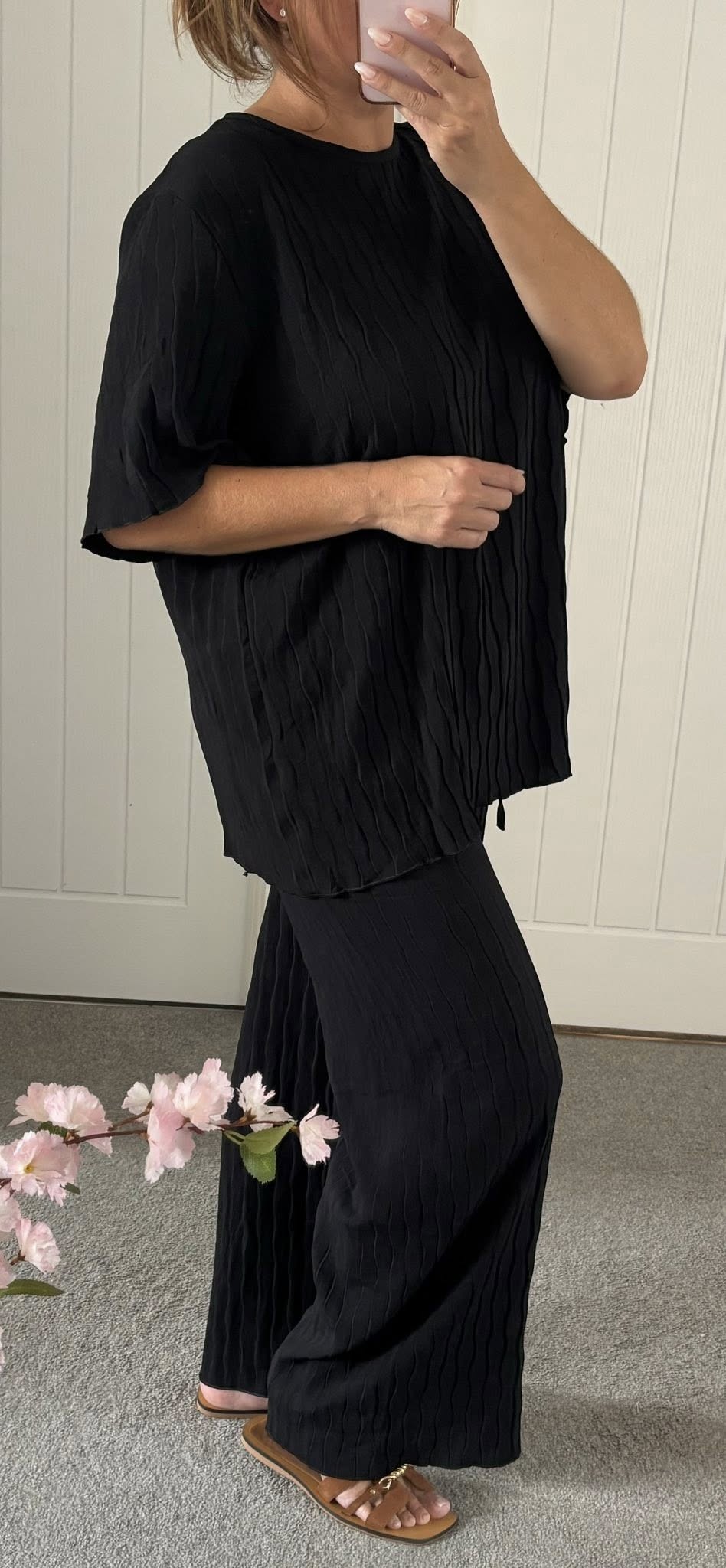 Crinkle Weave 2 Piece Wide Leg Co-Ord Suit – Black