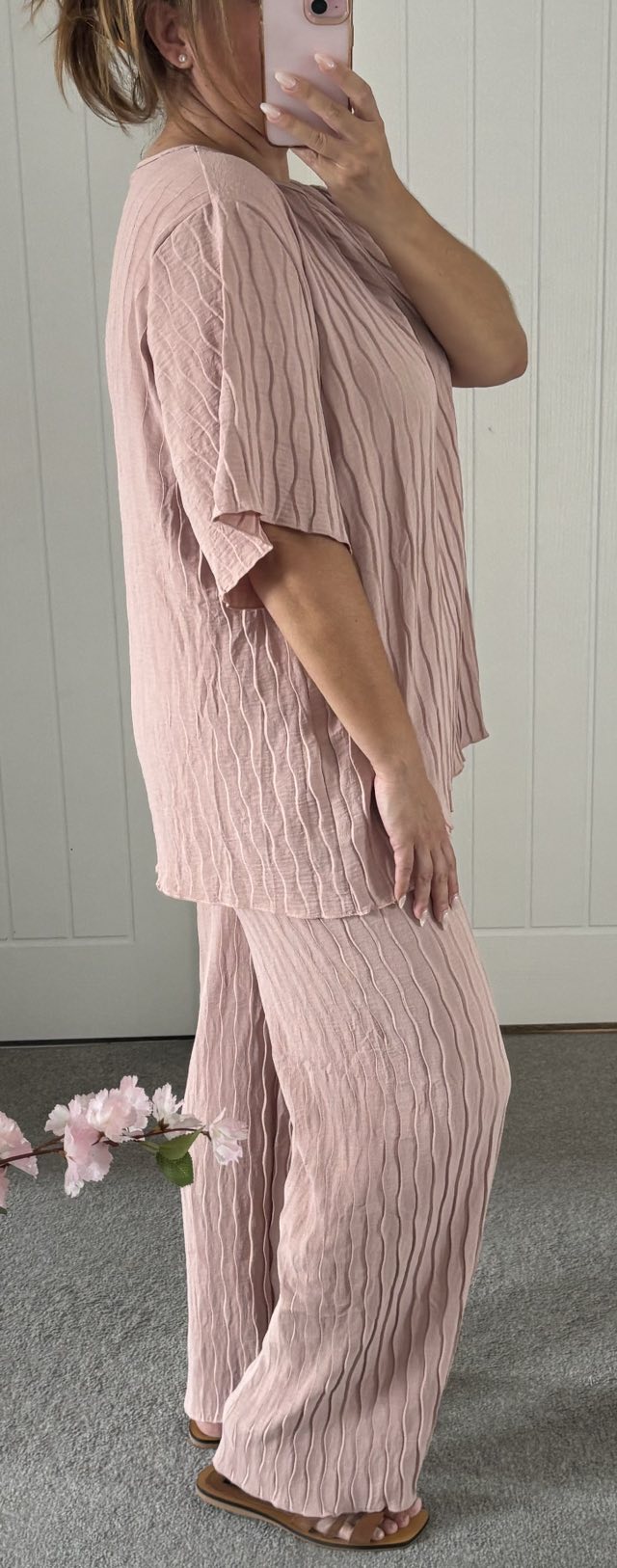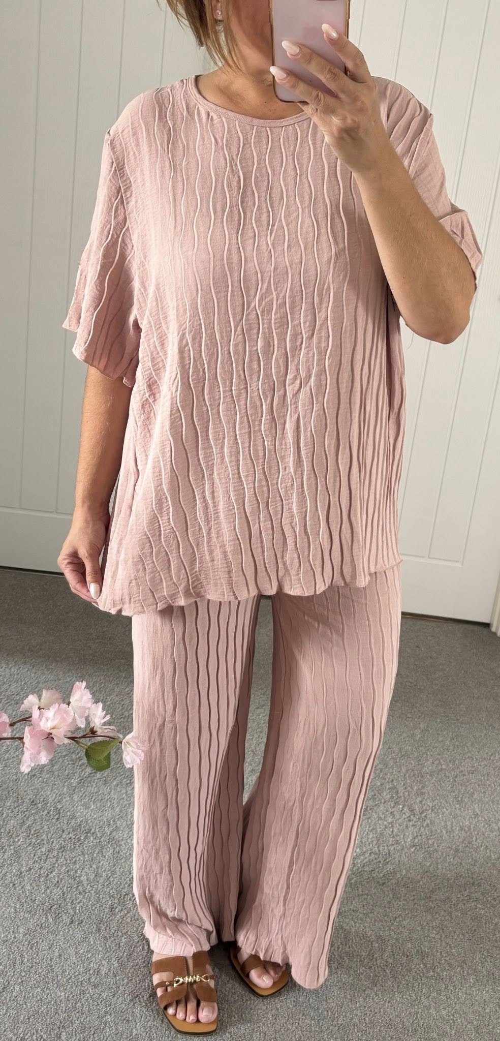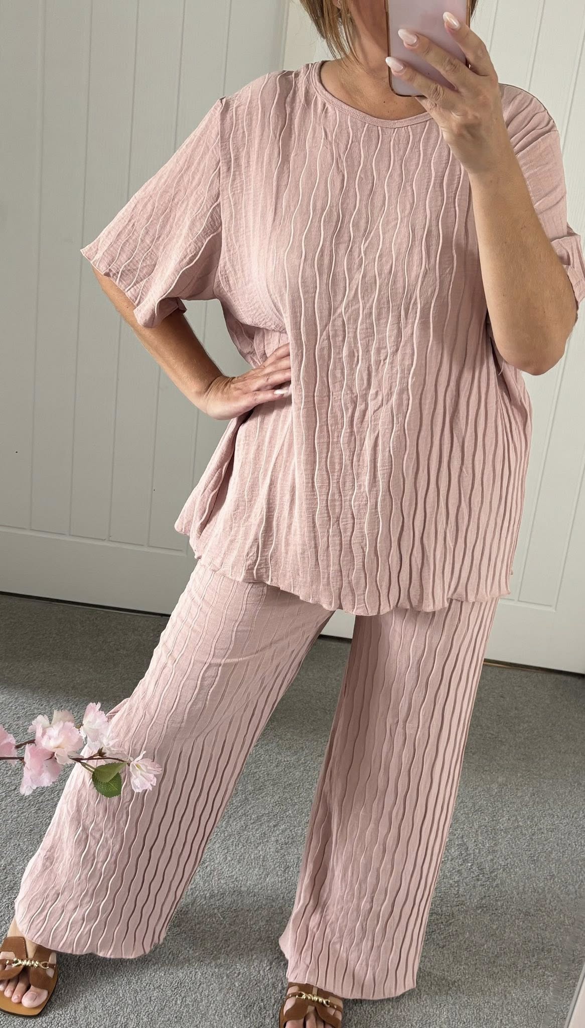 Crepe look fabric with a crinkle weave effect 2 piece trouser suit – Wide leg elasticated waist pull on wide leg trouser with loose fit longline t-shirt style top – One size fits up to a good 16 Just £18.99!!