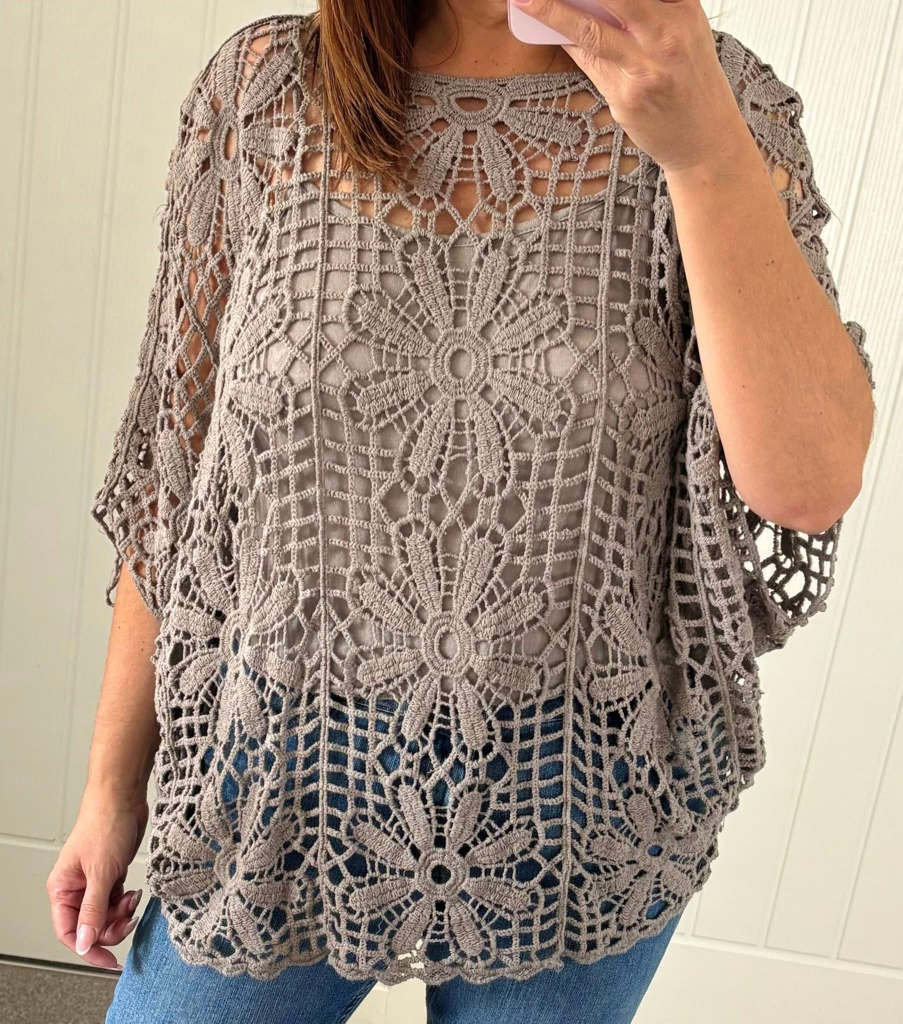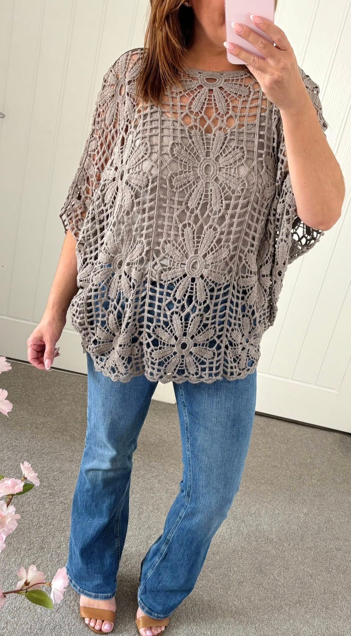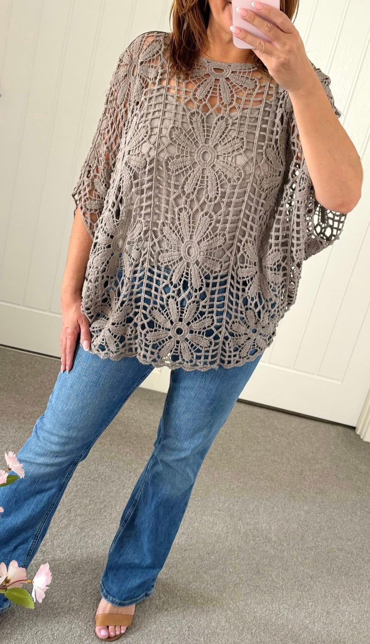 Gorgeous knit feel crochet top – Comes with matching sepearate vest top – Loose fit batwing style – So lovely on! One size fits up to a 16