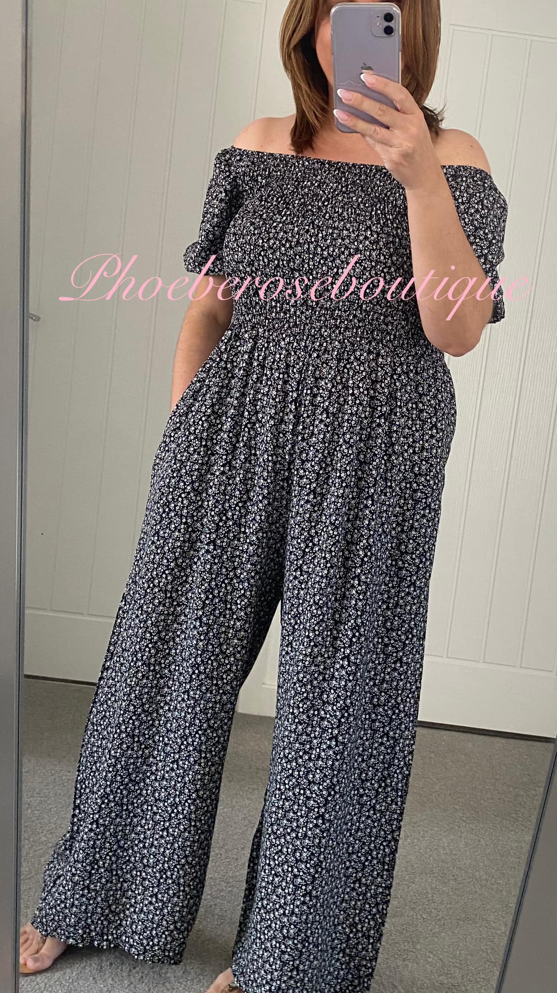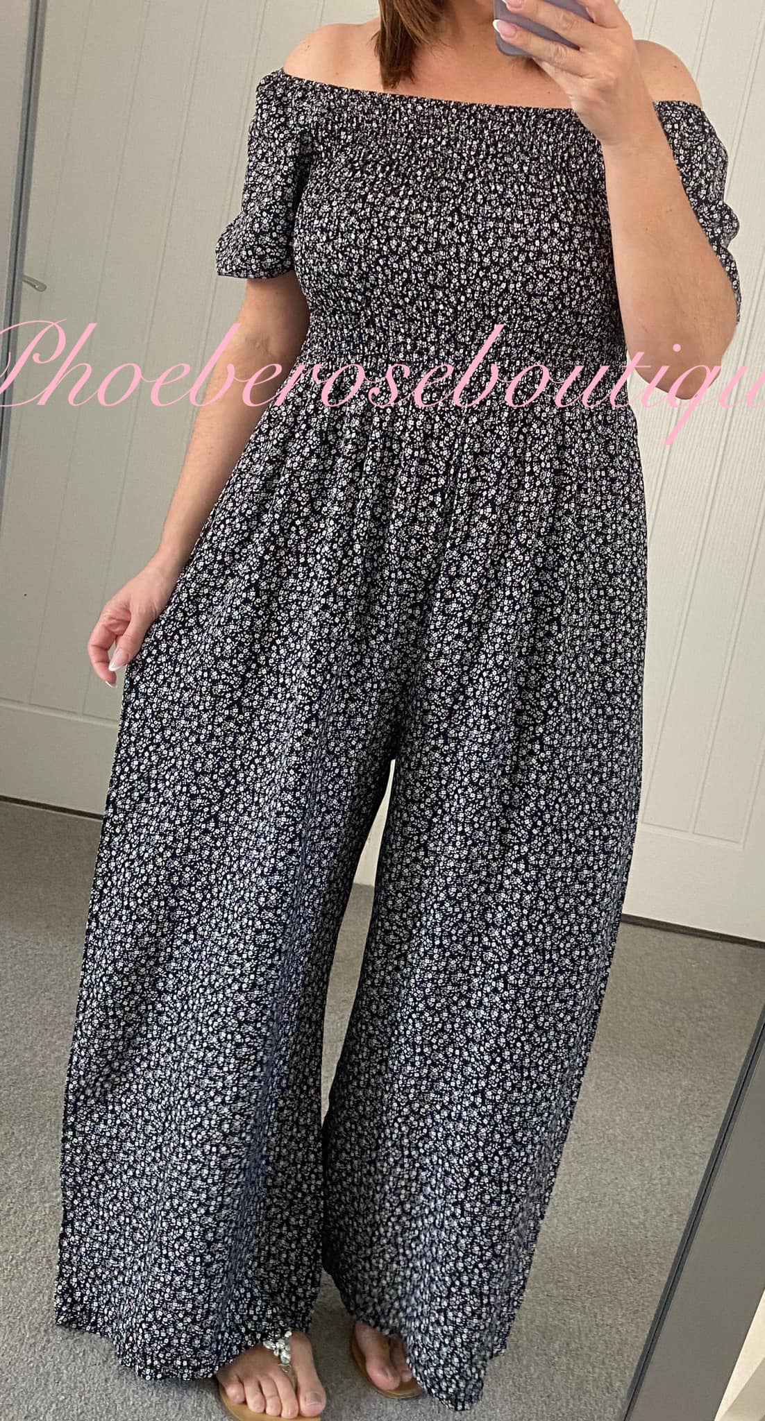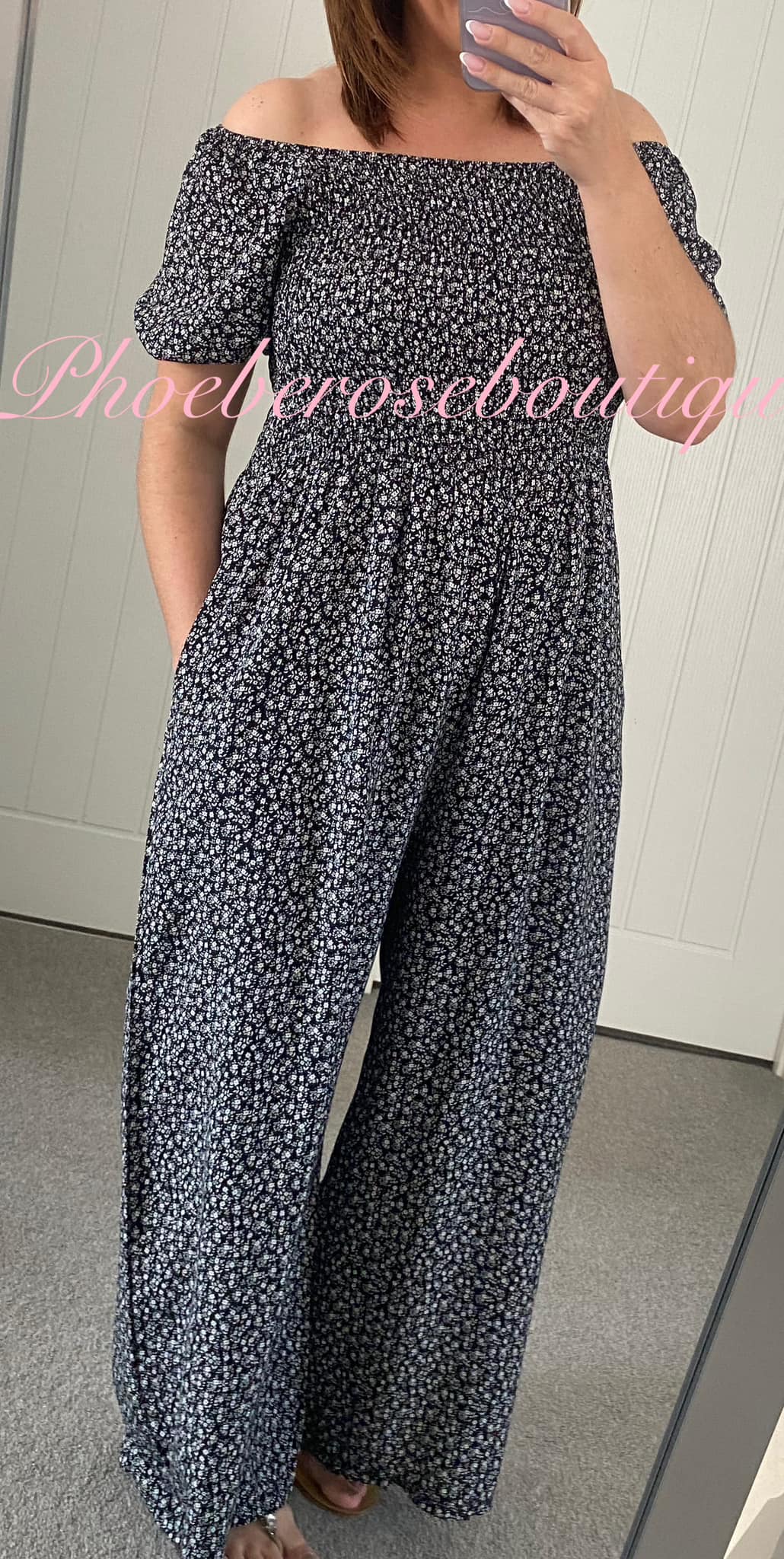 Stunning and comfy!! Ditsy floral print cotton feel wide leg jumpsuit with shirred elasticated bust and waistline and puff sleeves, can be worn on or off the shoulder – One size fits up to a 16/18
