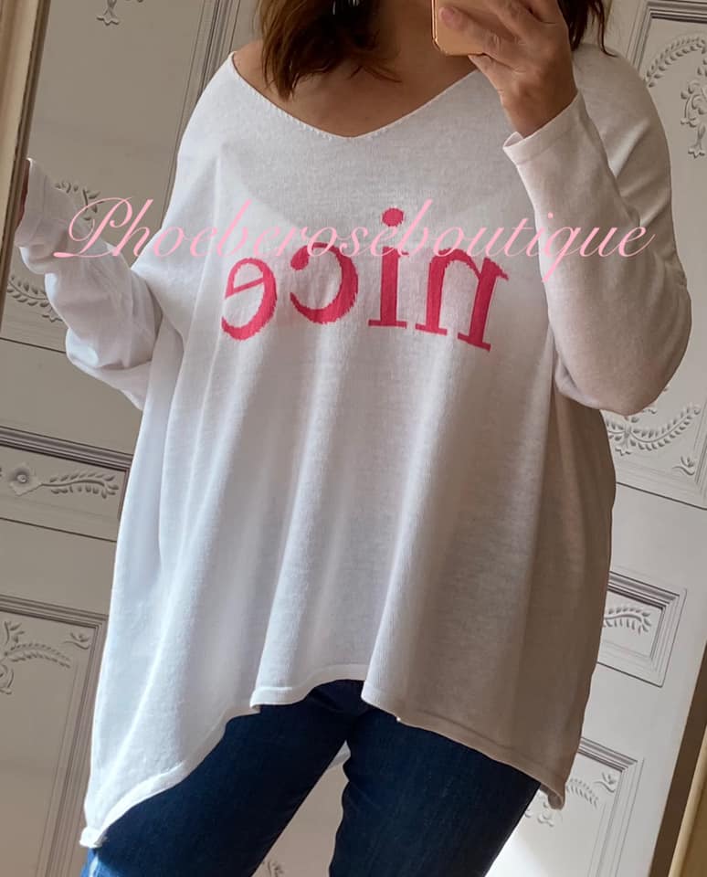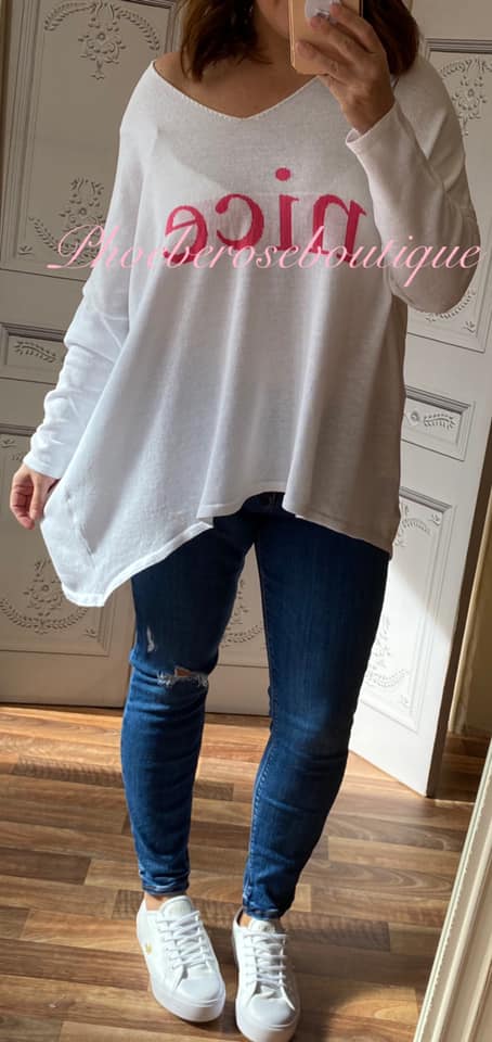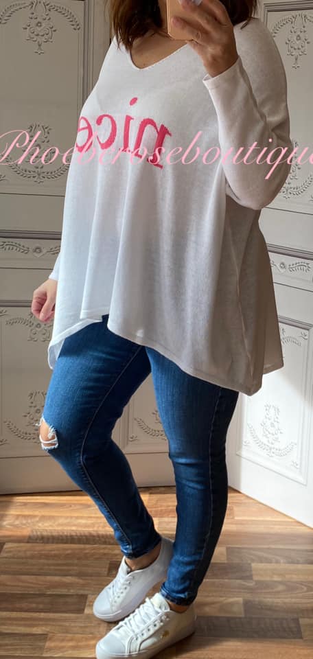 Fine-Knit Oversized Slouch ‘NICE’ Jumper – White