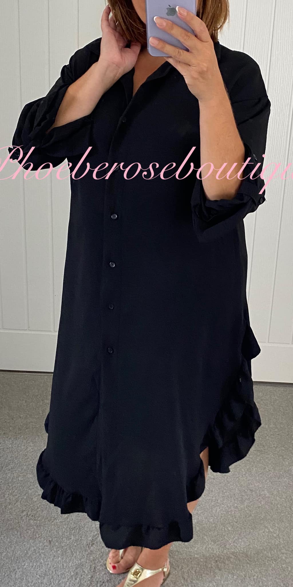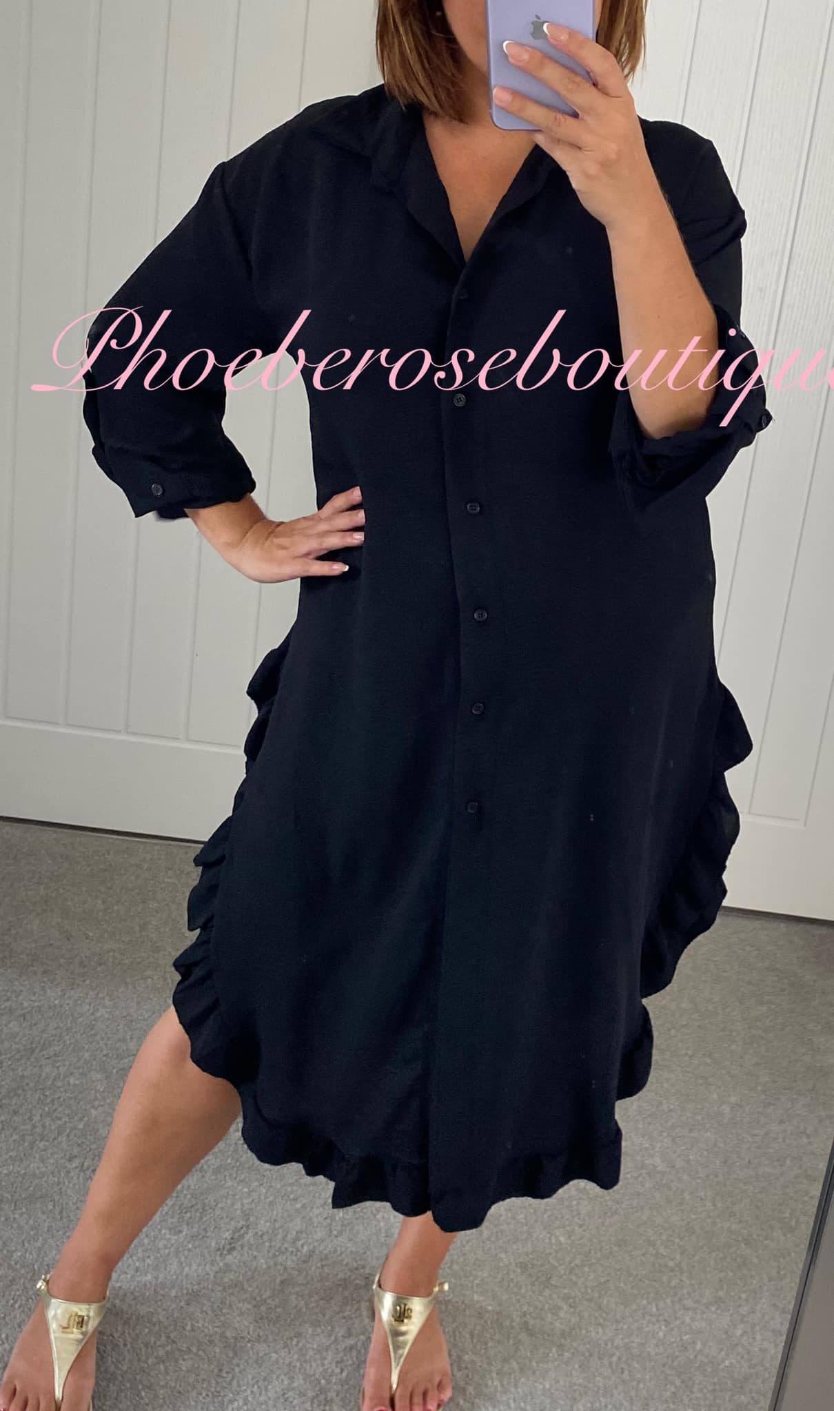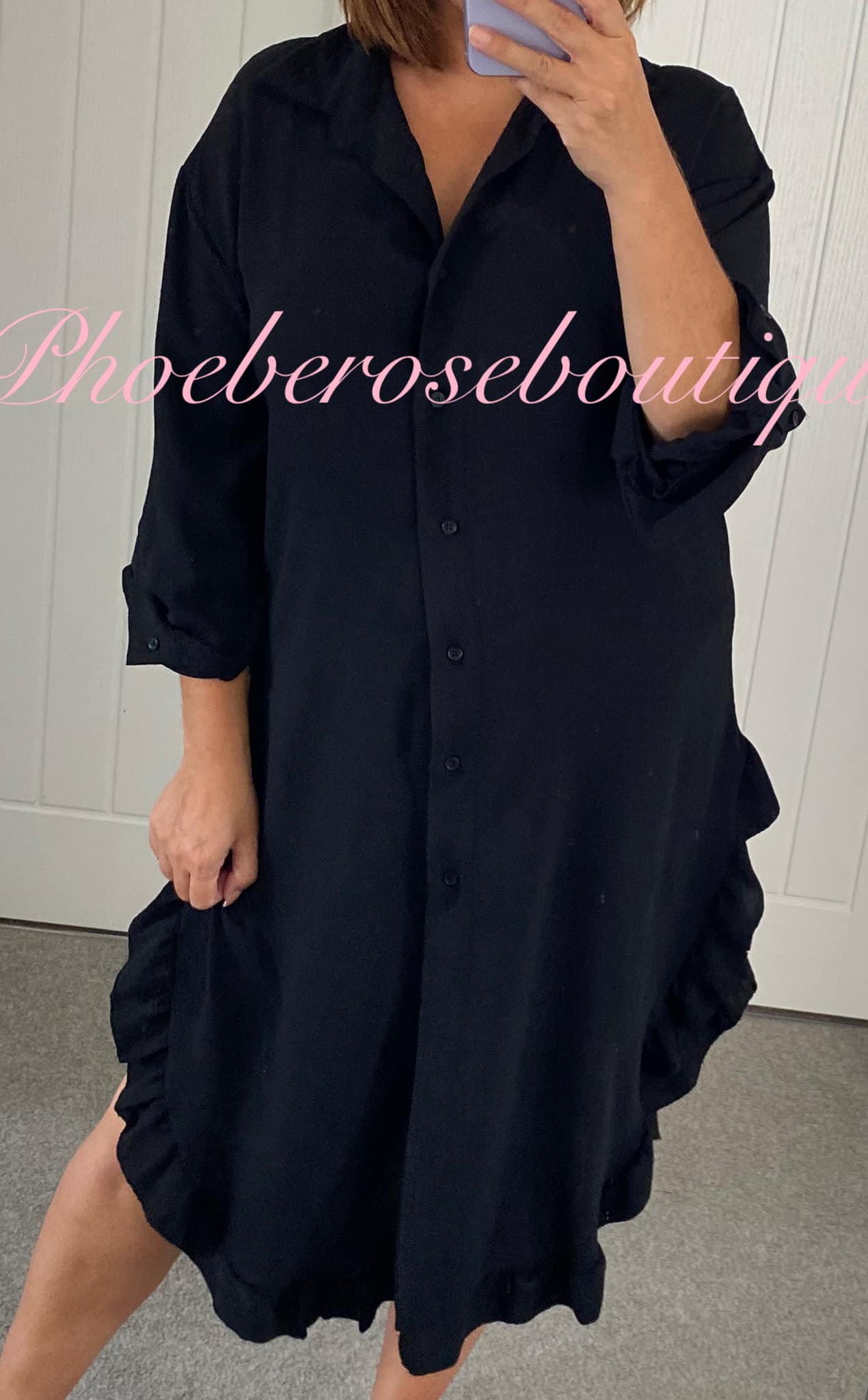 Be the first to review “Frill Hem Long Sleeve Midi Shirt Dress – Black”