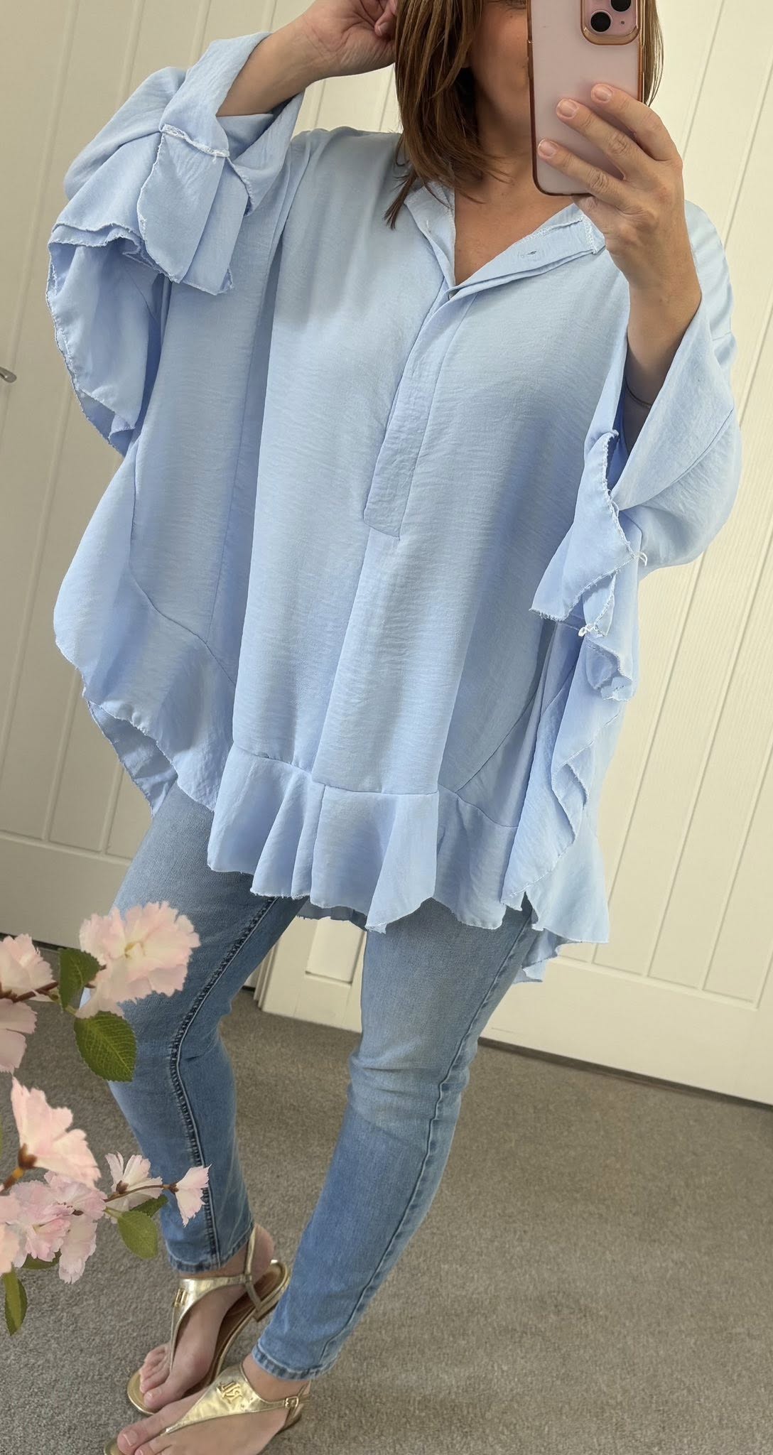 Crepe feel fabric oversized tunic style shirt – Gorgeous frill hem and sleeves – One size fits up to a 20