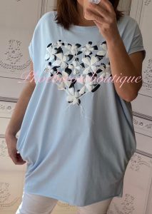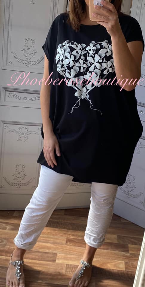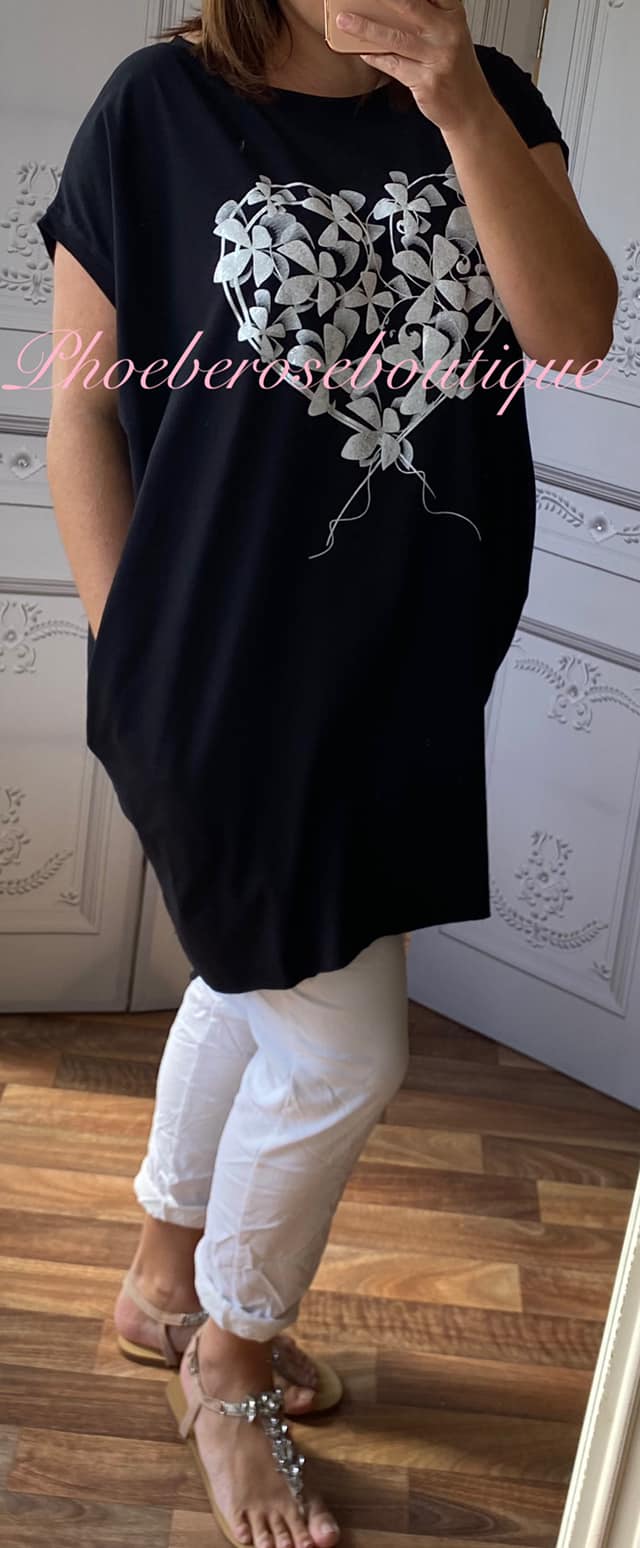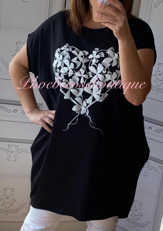 Glittery Floral Heart Stretch Jersey Cap Sleeve Pocket Tunic Top – Black