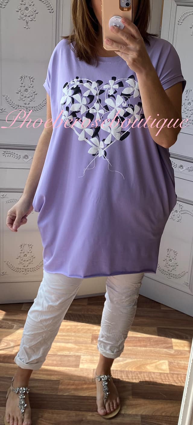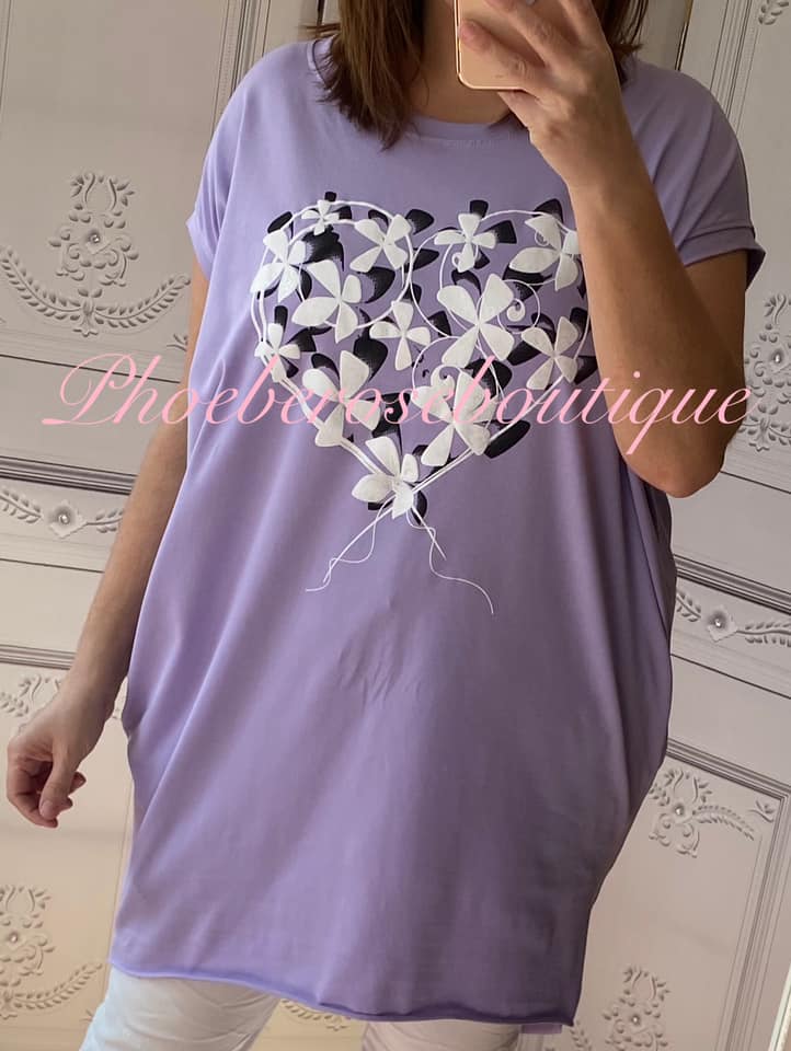 Glittery Floral Heart Stretch Jersey Cap Sleeve Pocket Tunic Top – Lilac