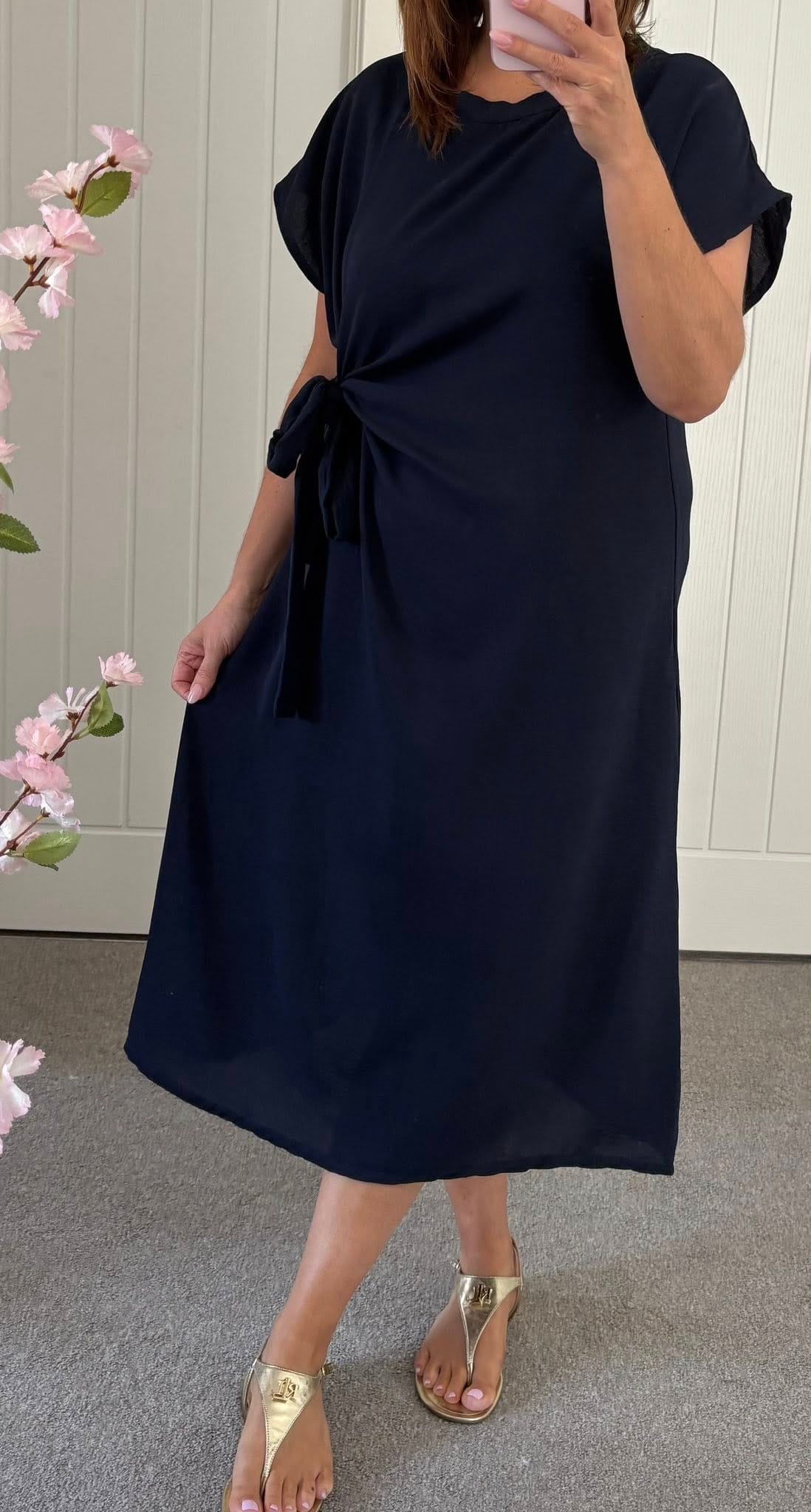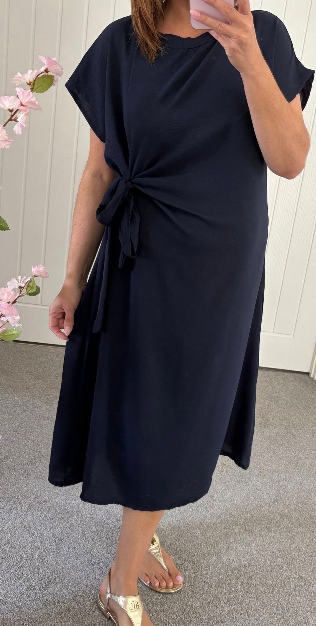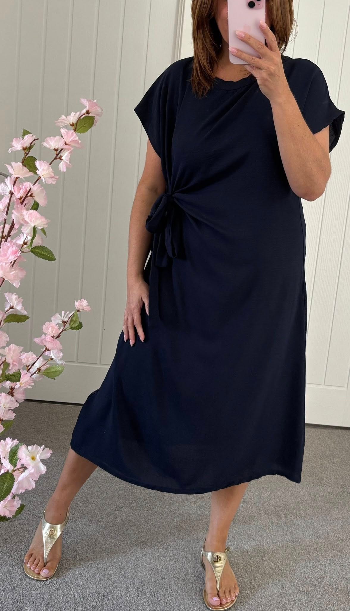 Stretch crepe fabric – Midi length dress – slight a-line skirt with flattering tie side detail – One size fits up to a 16