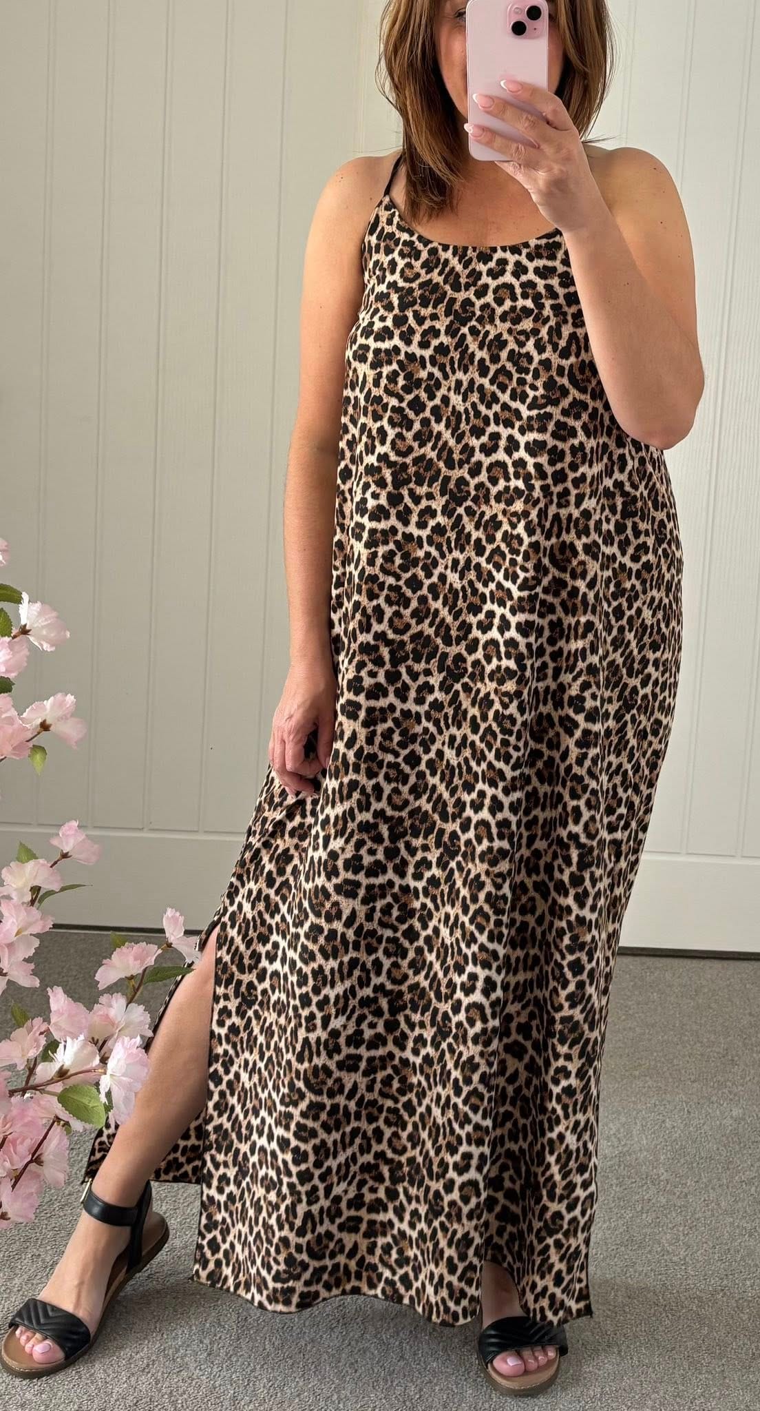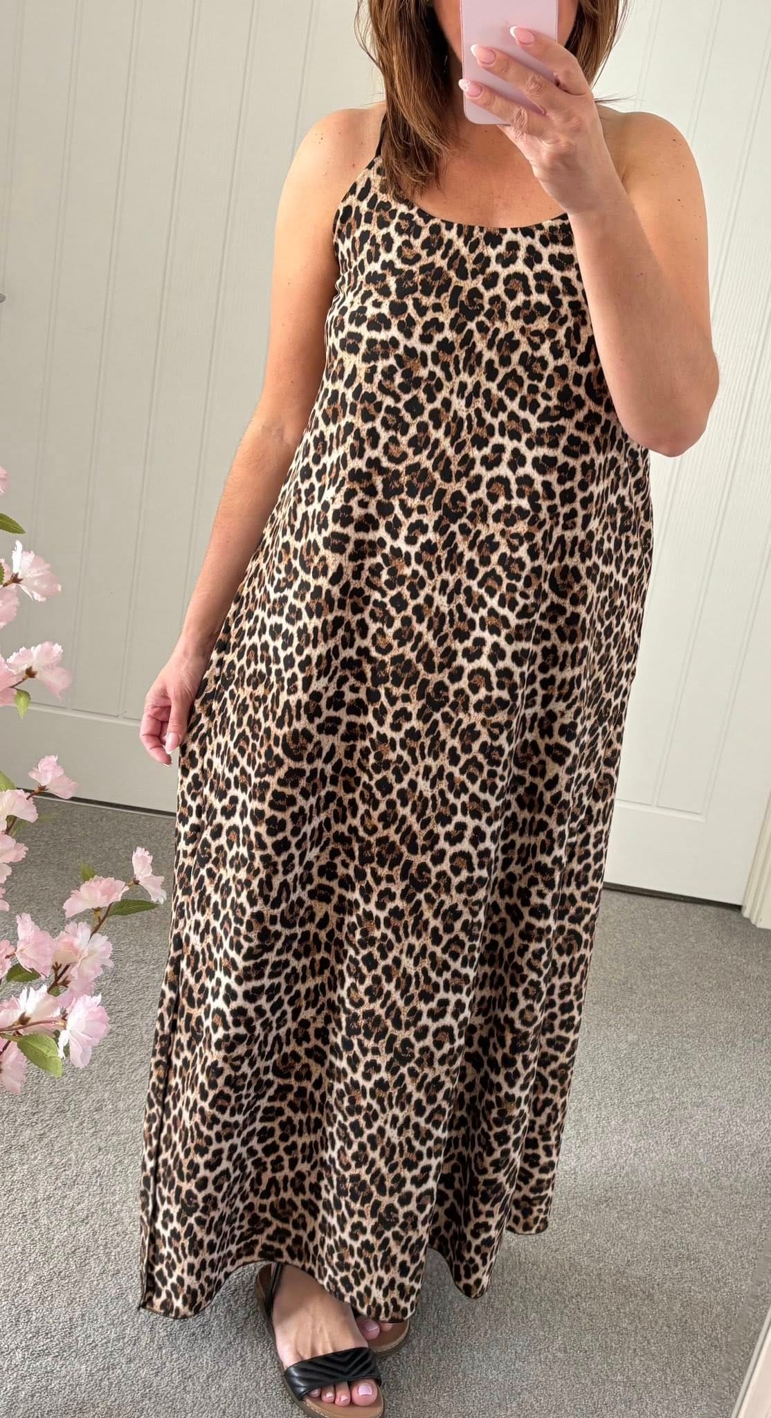 Soft stretch satin feel fabric an an all over lepo print – A line maxi dress with elasticated back and elasticates cross over spaghetti shoulder straps – One size fits up to a 16 – So versatile! Dress up or down a real wardrobe essential!!