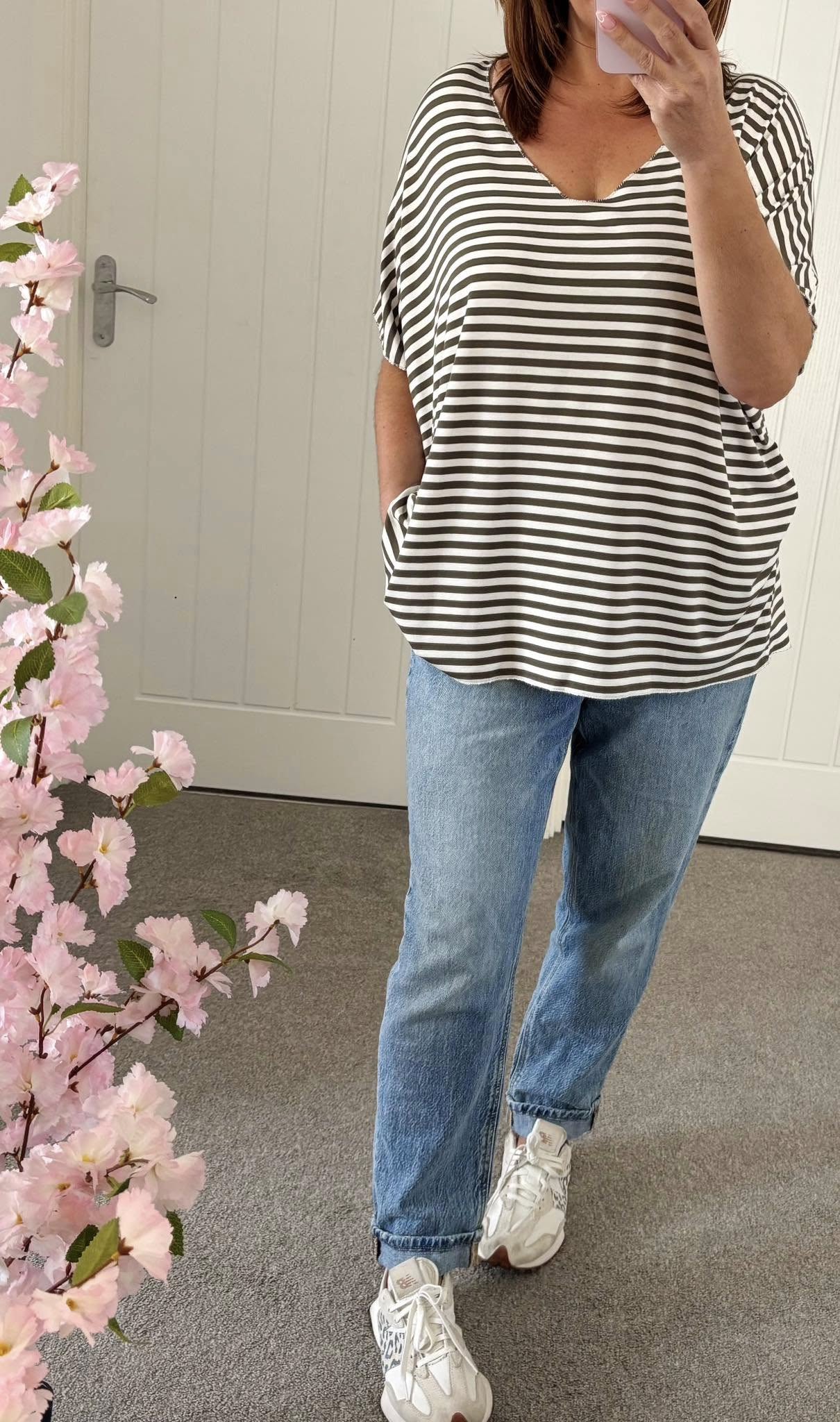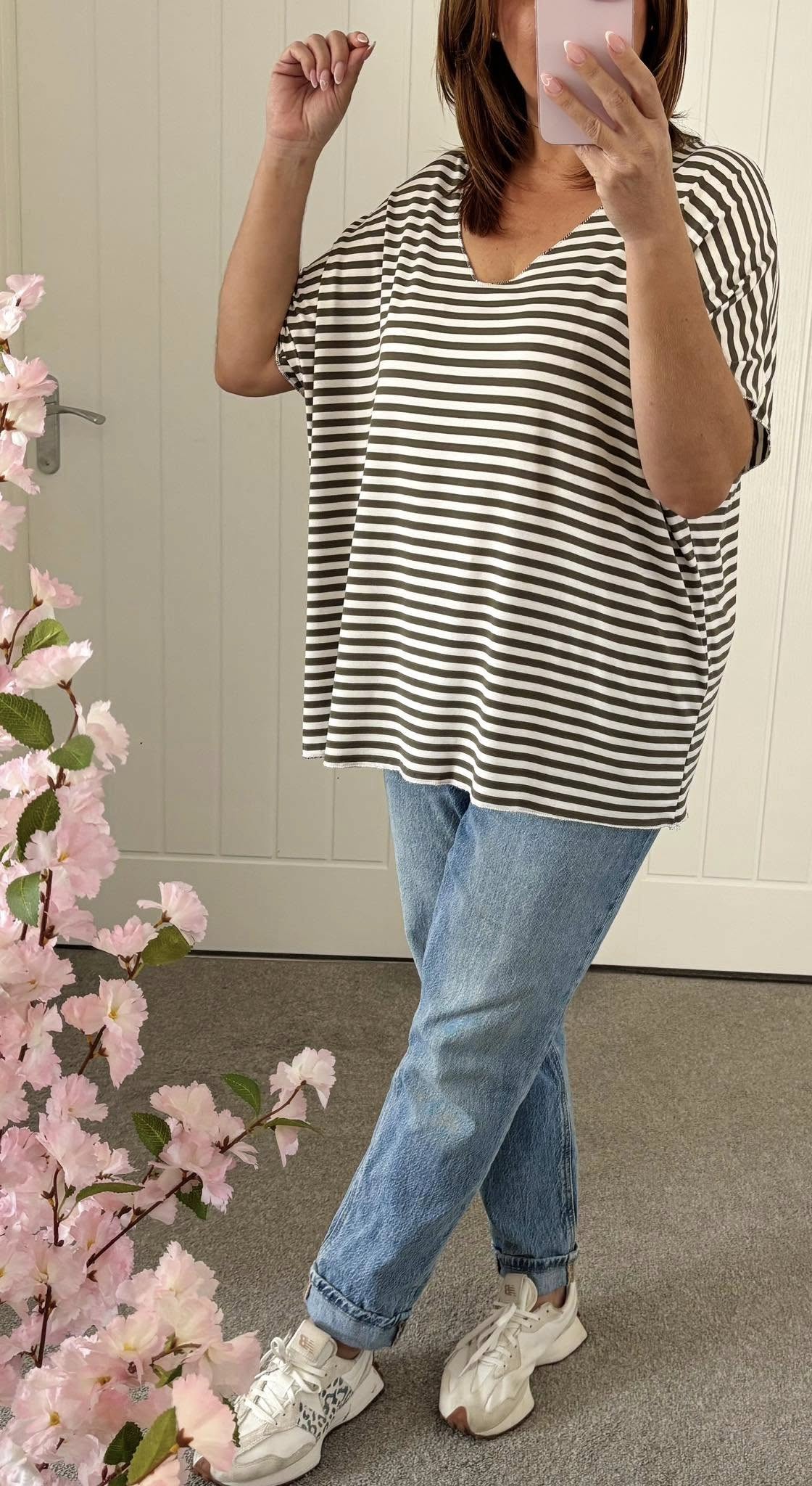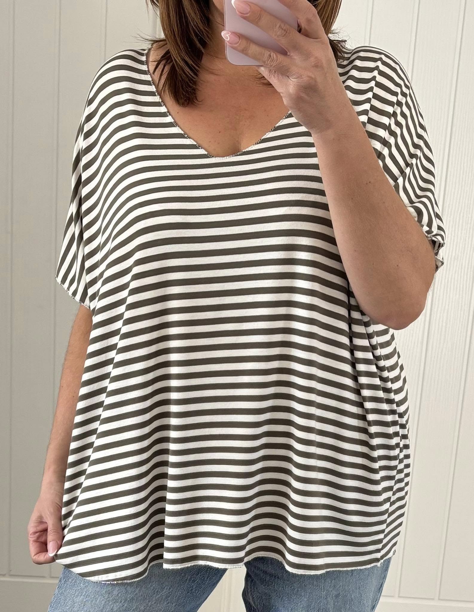 Loose fit Stripe V Neck T-Shirt – Khaki