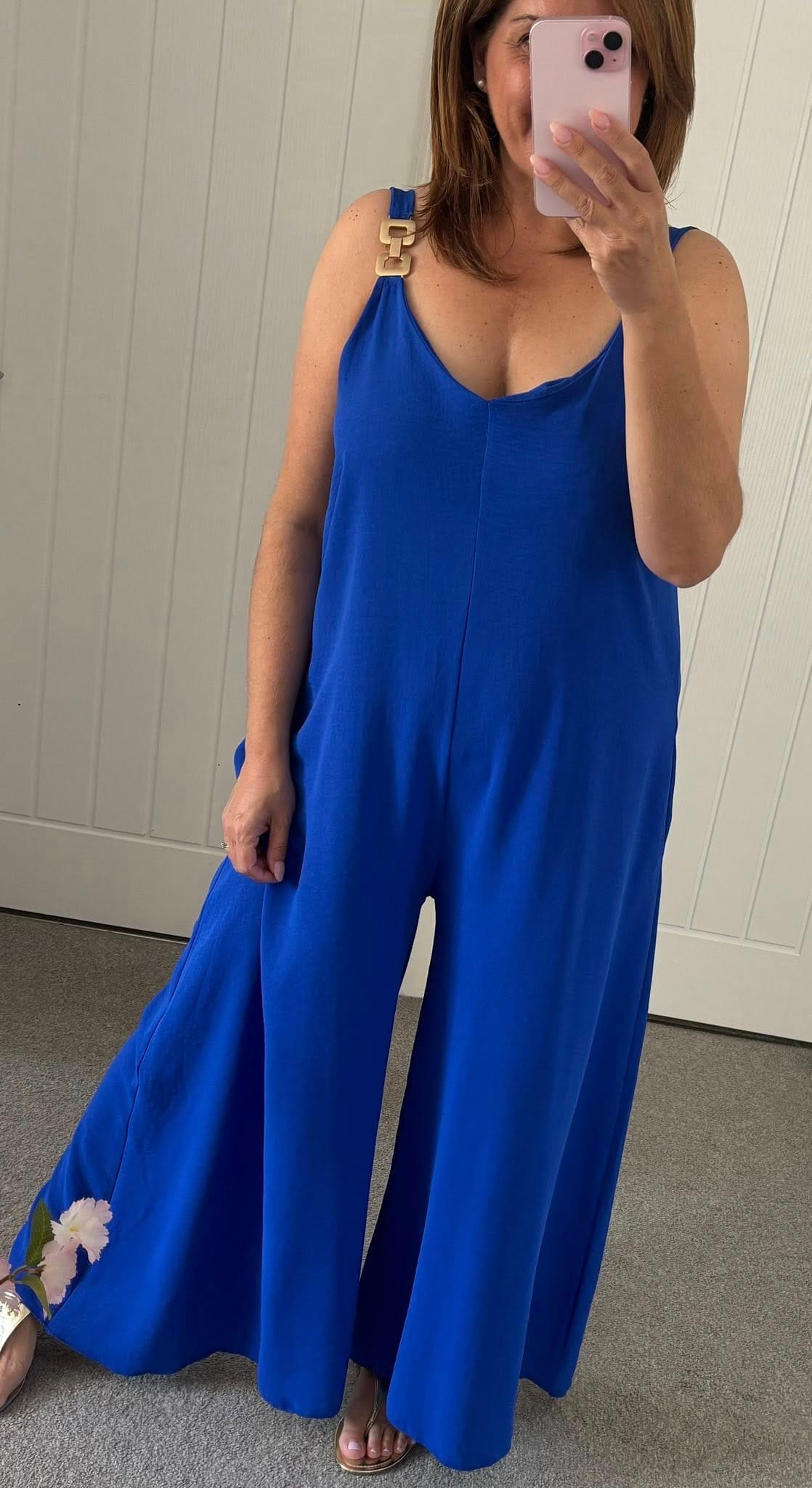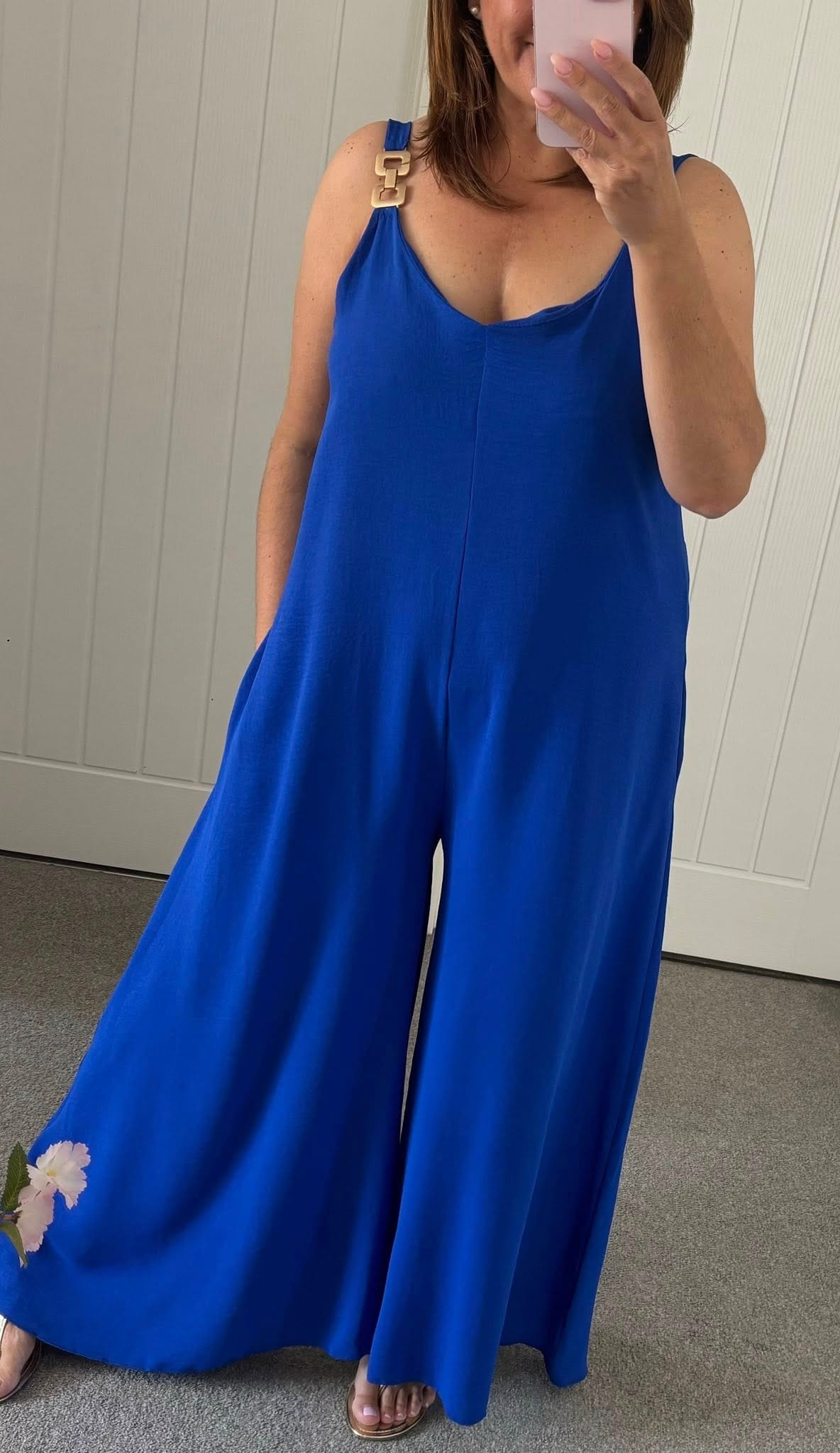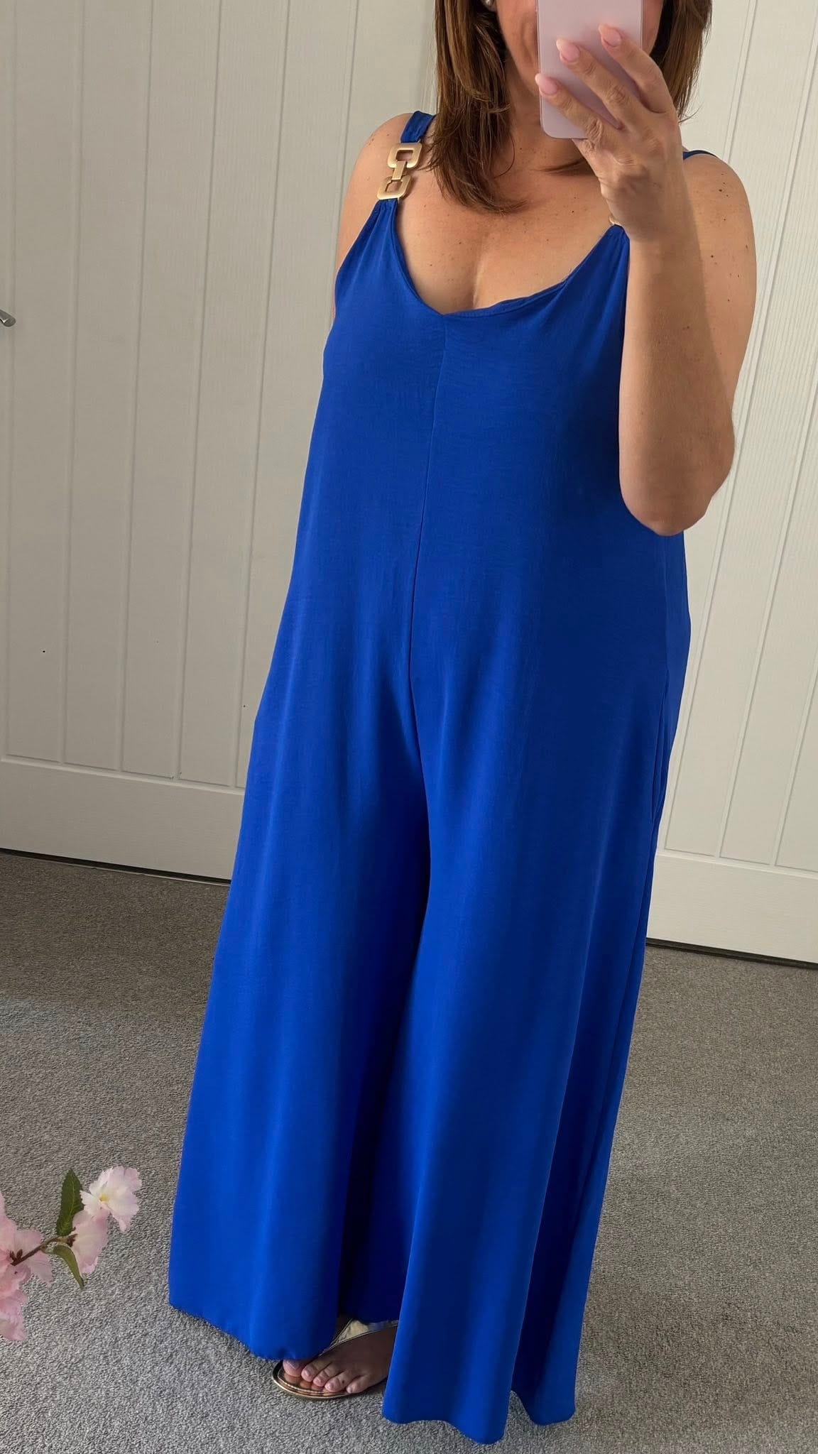 Stunning loose fit jumpsuit with metal look detail on straps – crepe feel print fabric – Loose fit style, One size fits up to a 16