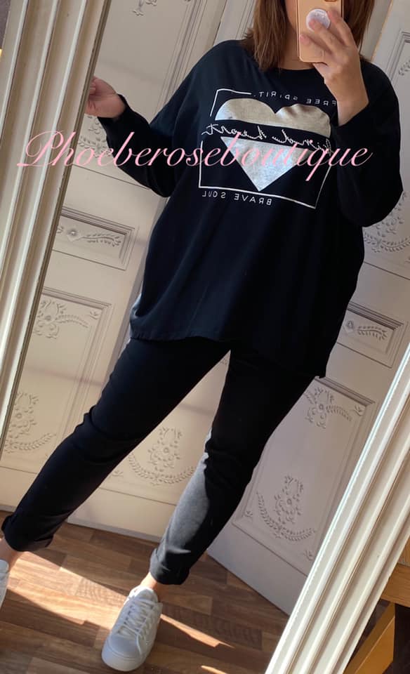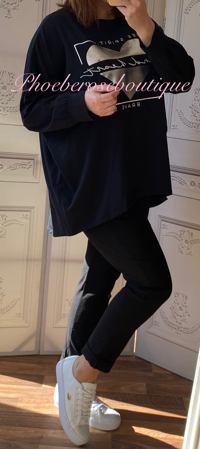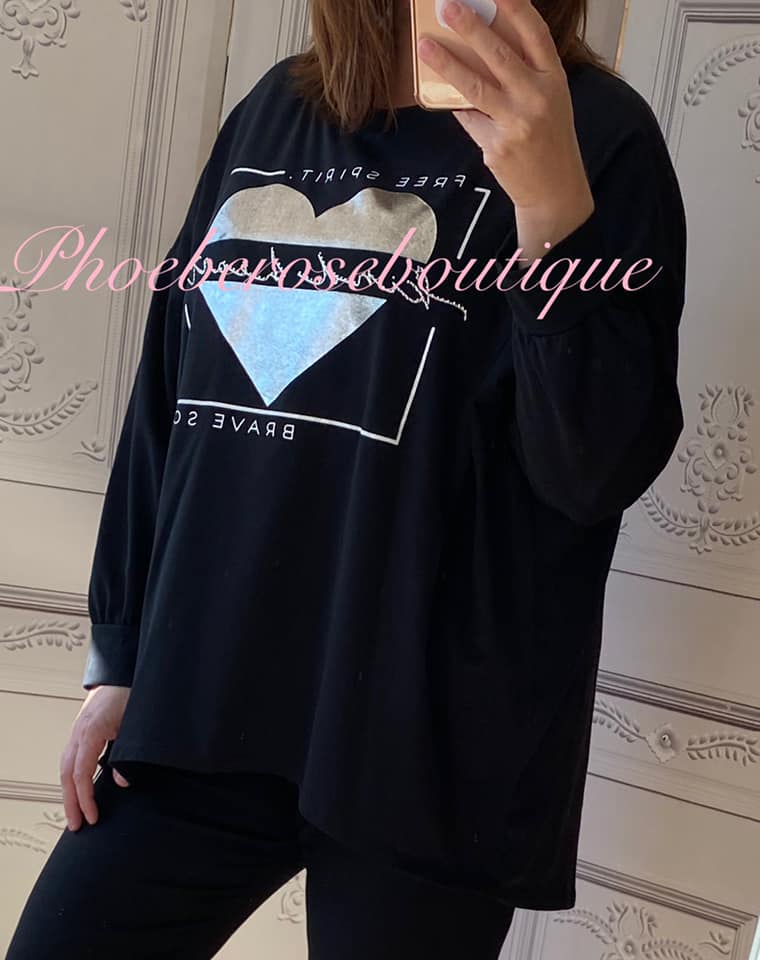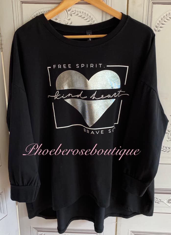 Metallic Heart ‘Free Spirit, Kind Heart, Brave Soul’ Logo Studded Loose Fit Top – Black