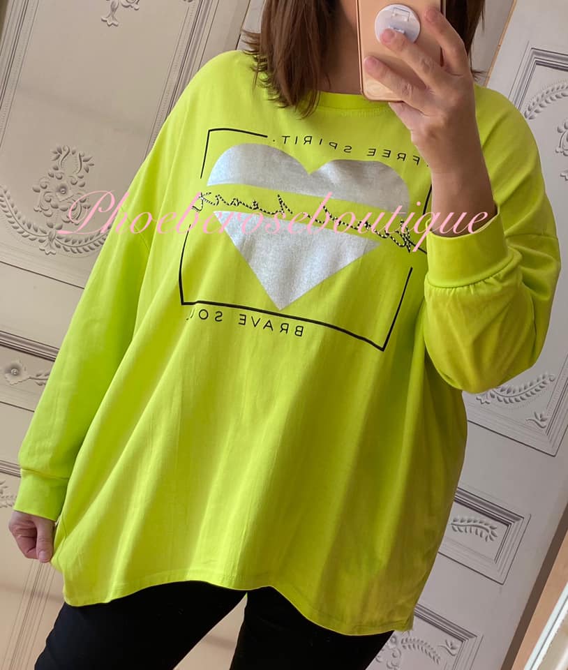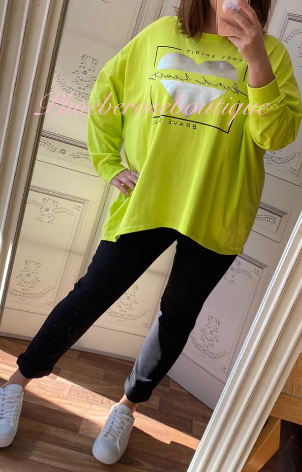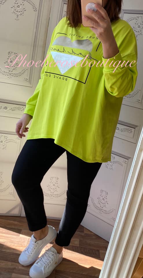 Metallic Heart ‘Free Spirit, Kind Heart, Brave Soul’ Logo Studded Loose Fit Top – Lime
