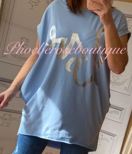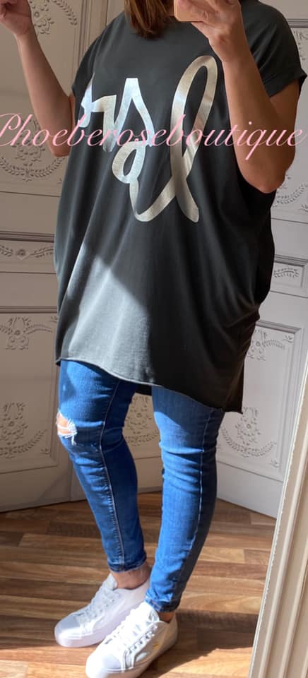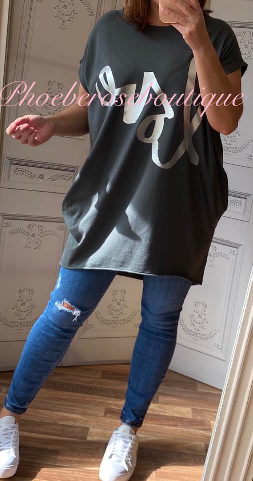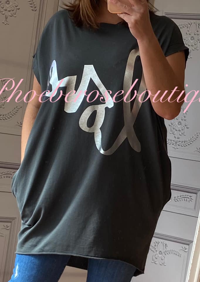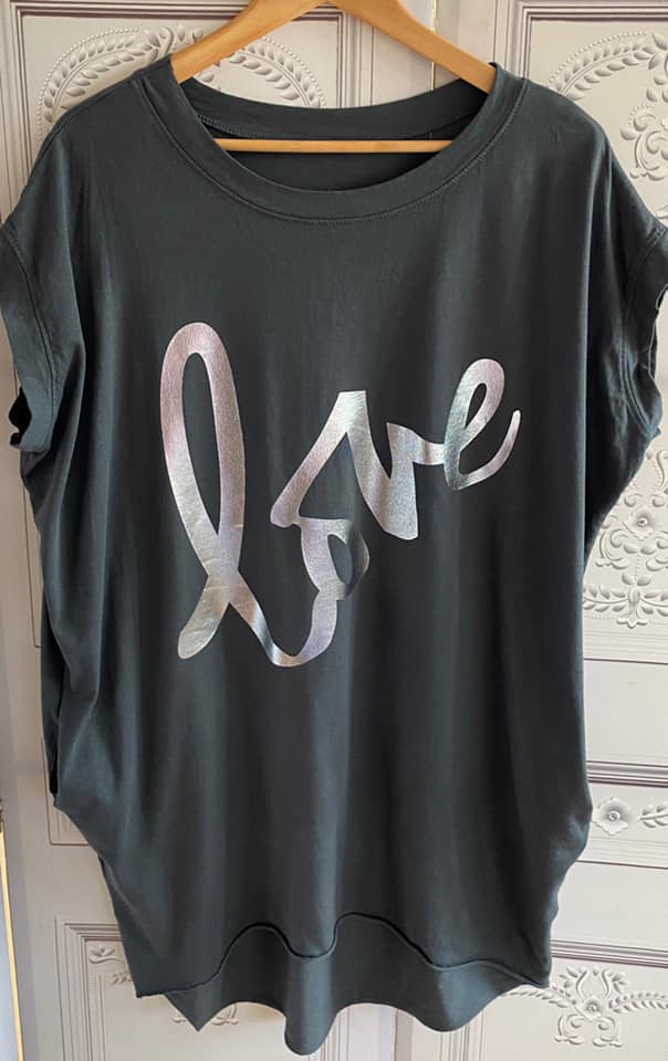 Metallic LOVE words Stretch Jersey Cap Sleeve Pocket Tunic Top – Dark Grey