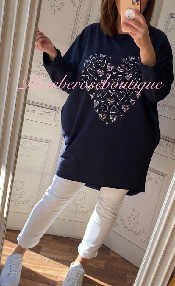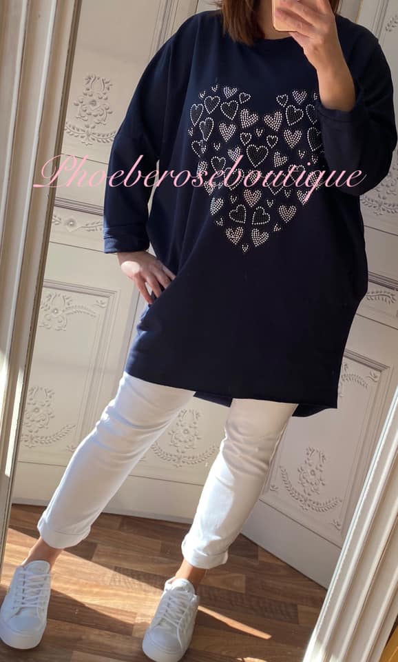 Multi Heart Stud Loose Fit Pocket Sweat Tunic/Top – Navy