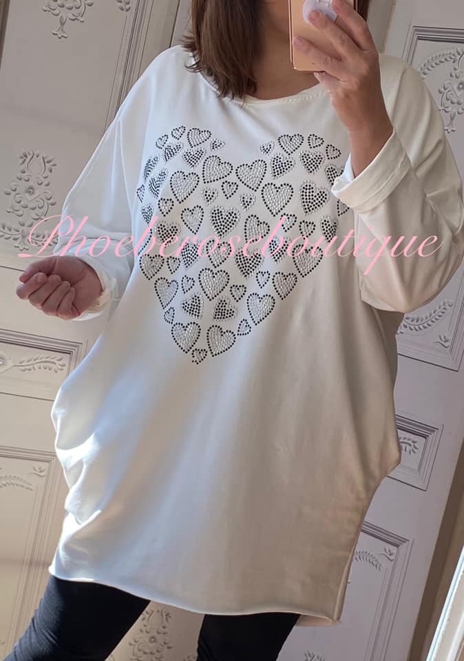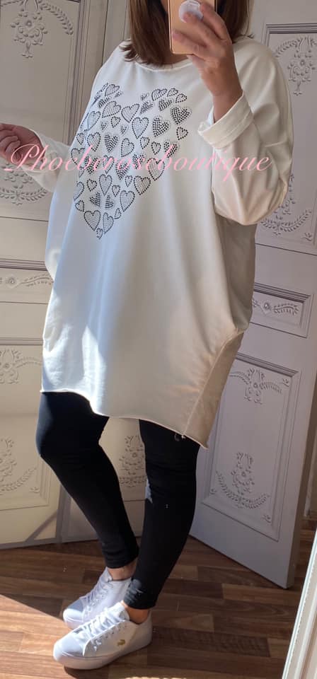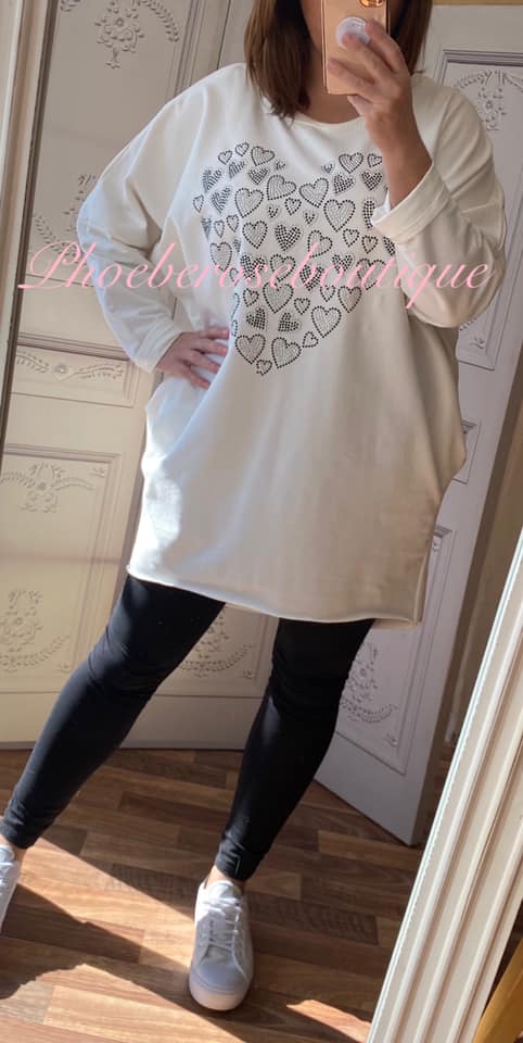 Multi Heart Stud Loose Fit Pocket Sweat Tunic/Top – Off White