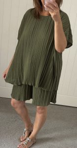 Stunning 2 piece short set – Stretch crepe pleated fabric – Loose fit oversized style top and pull on elasticated waistband shorts with pockets – One size fits up to an 18 – Dress up or down!