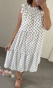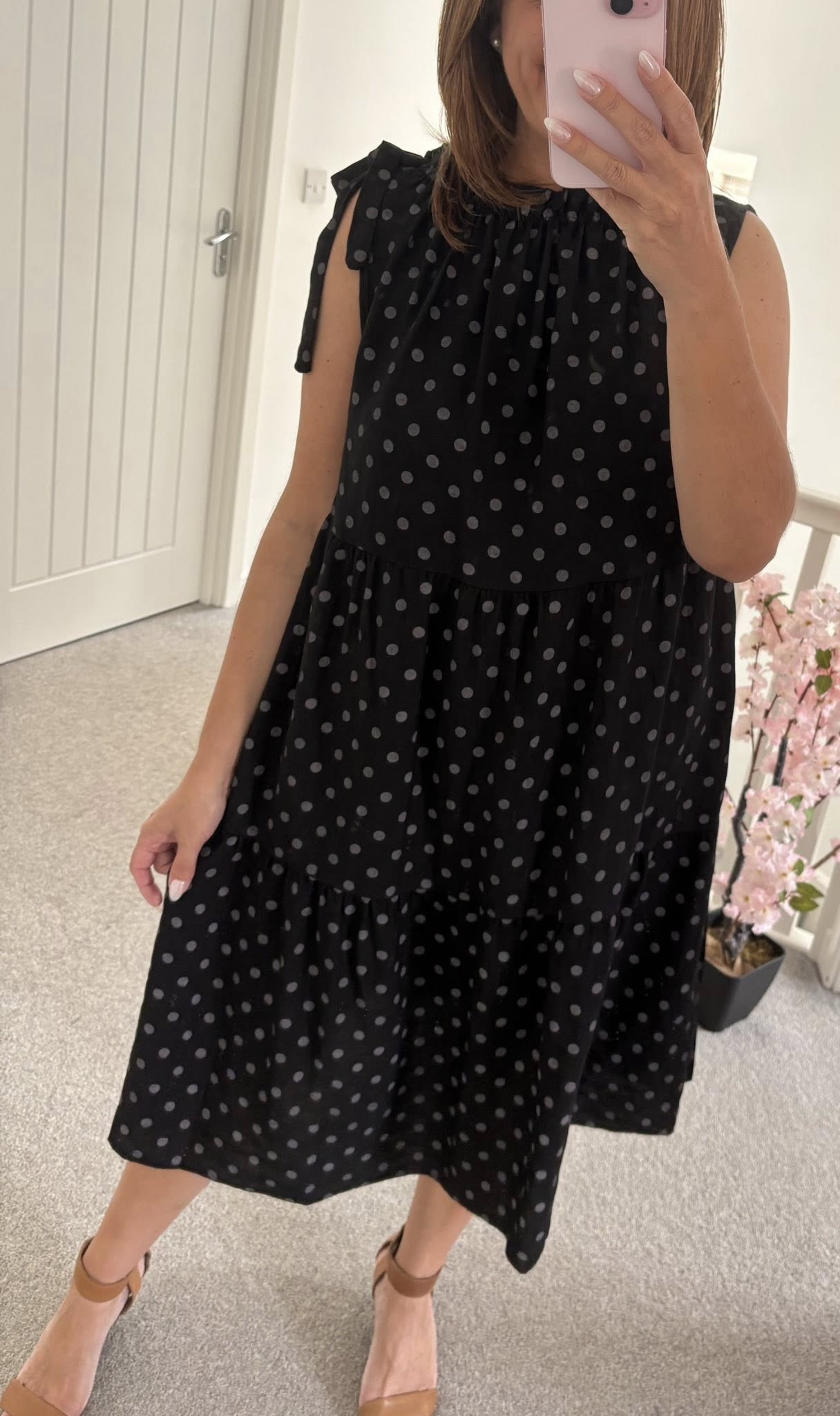 Cotton feel dress – All over polka dot design – High elasticated neckline with mock tie detail – Tiered loose fit style – Midi length – One size fits up to an 18