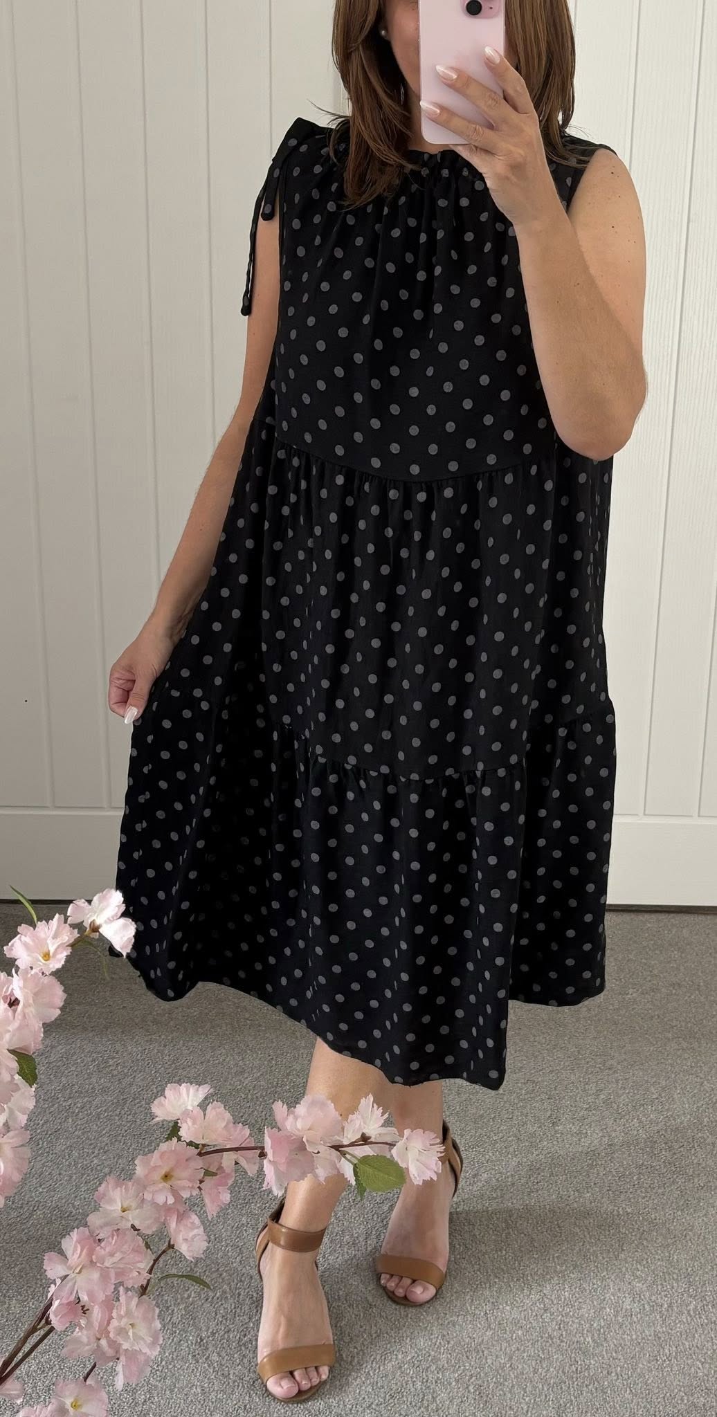 Polka Dot Bow Tie Neck Tiered Midi Dress – Black/White