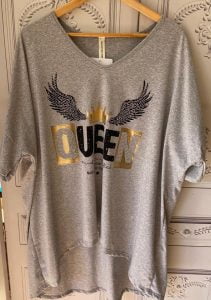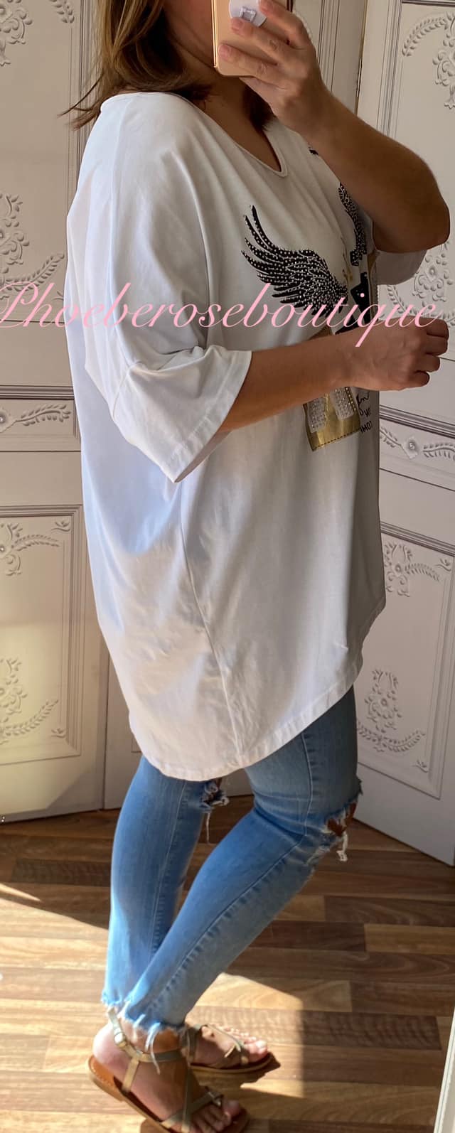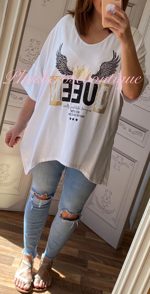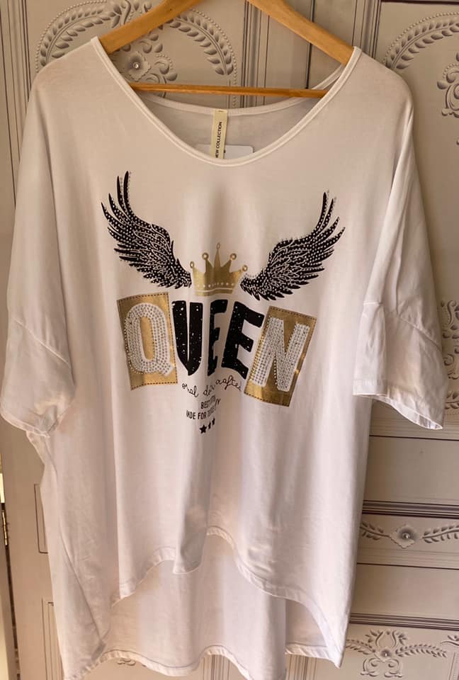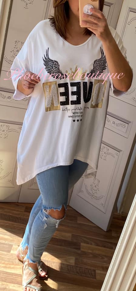 ‘Queen’ Sparkly Oversized Hi-Low T-Shirt – White
