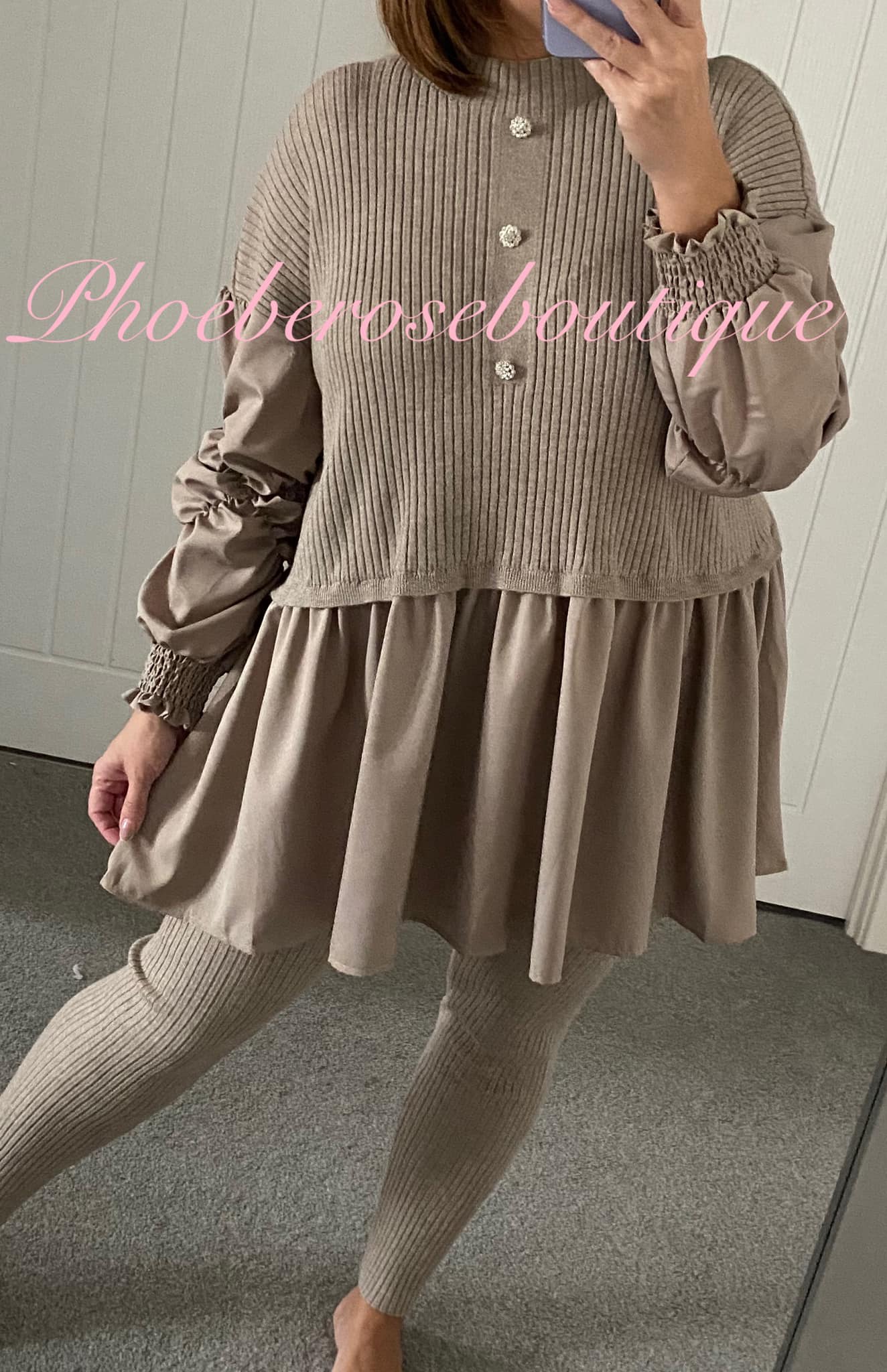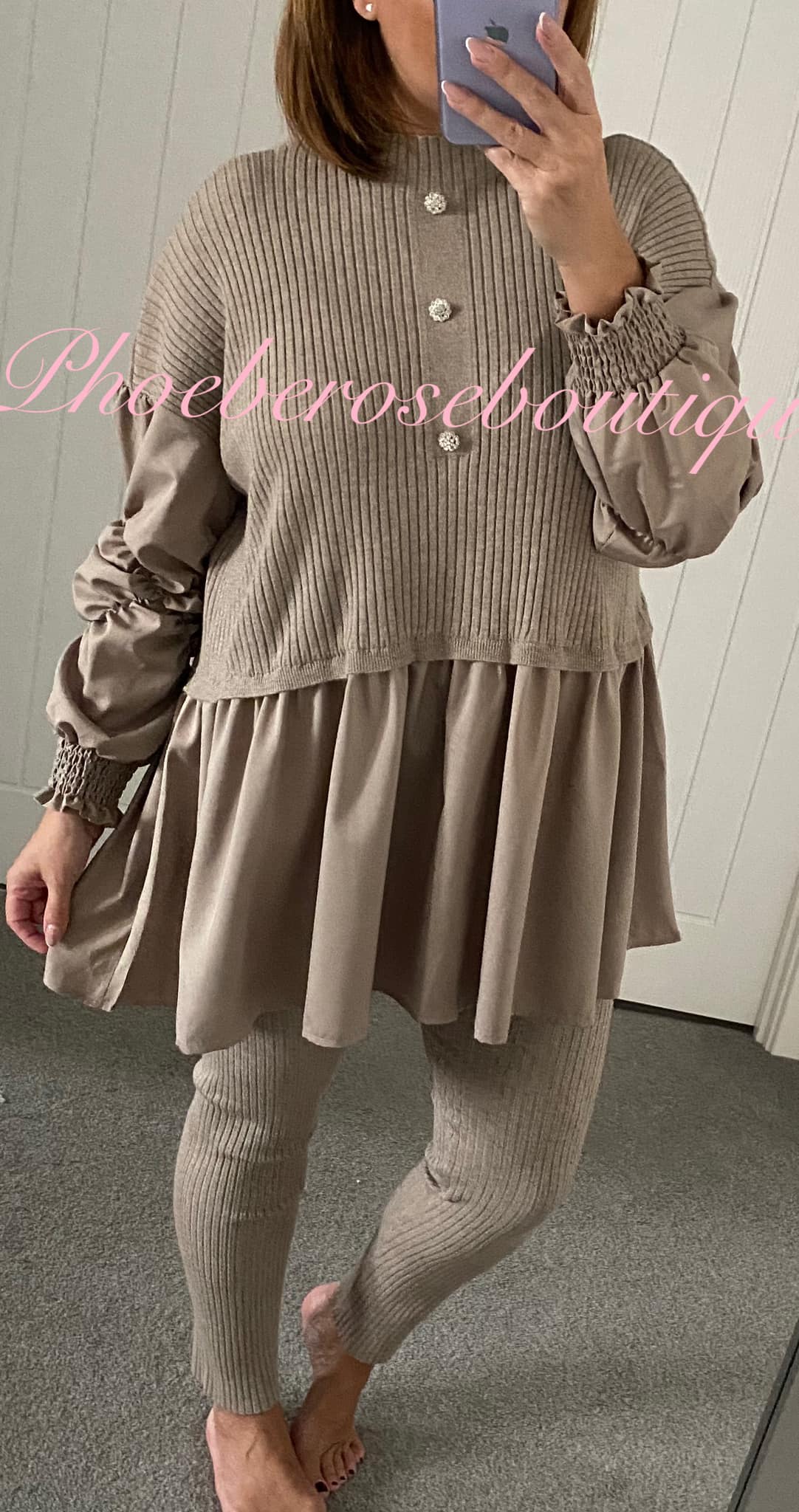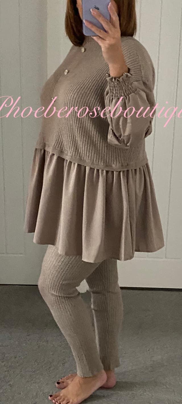 Satin Frill Soft Knit Ribbed Diamante Button Lounge-Suit – Mocha