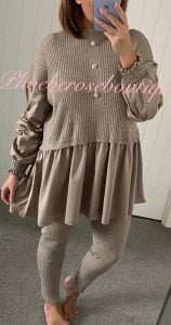 Be the first to review “Satin Frill Soft Knit Ribbed Diamante Button Lounge-Suit – Soft Grey”