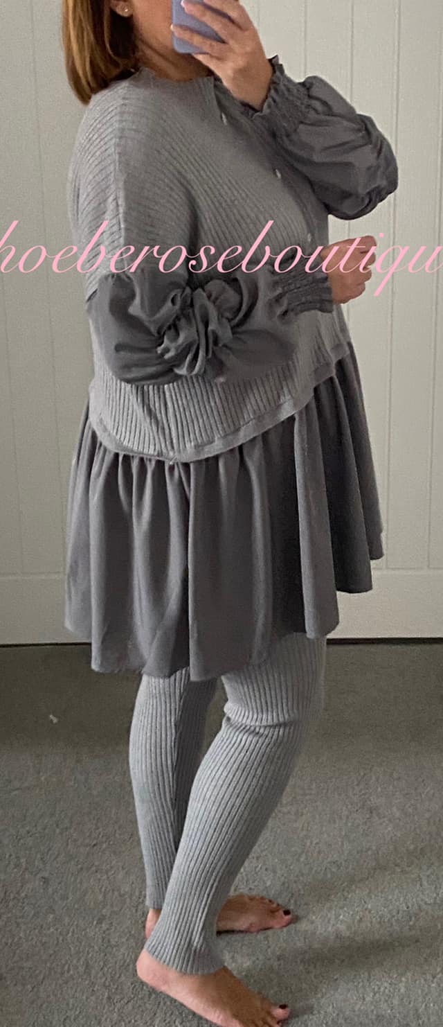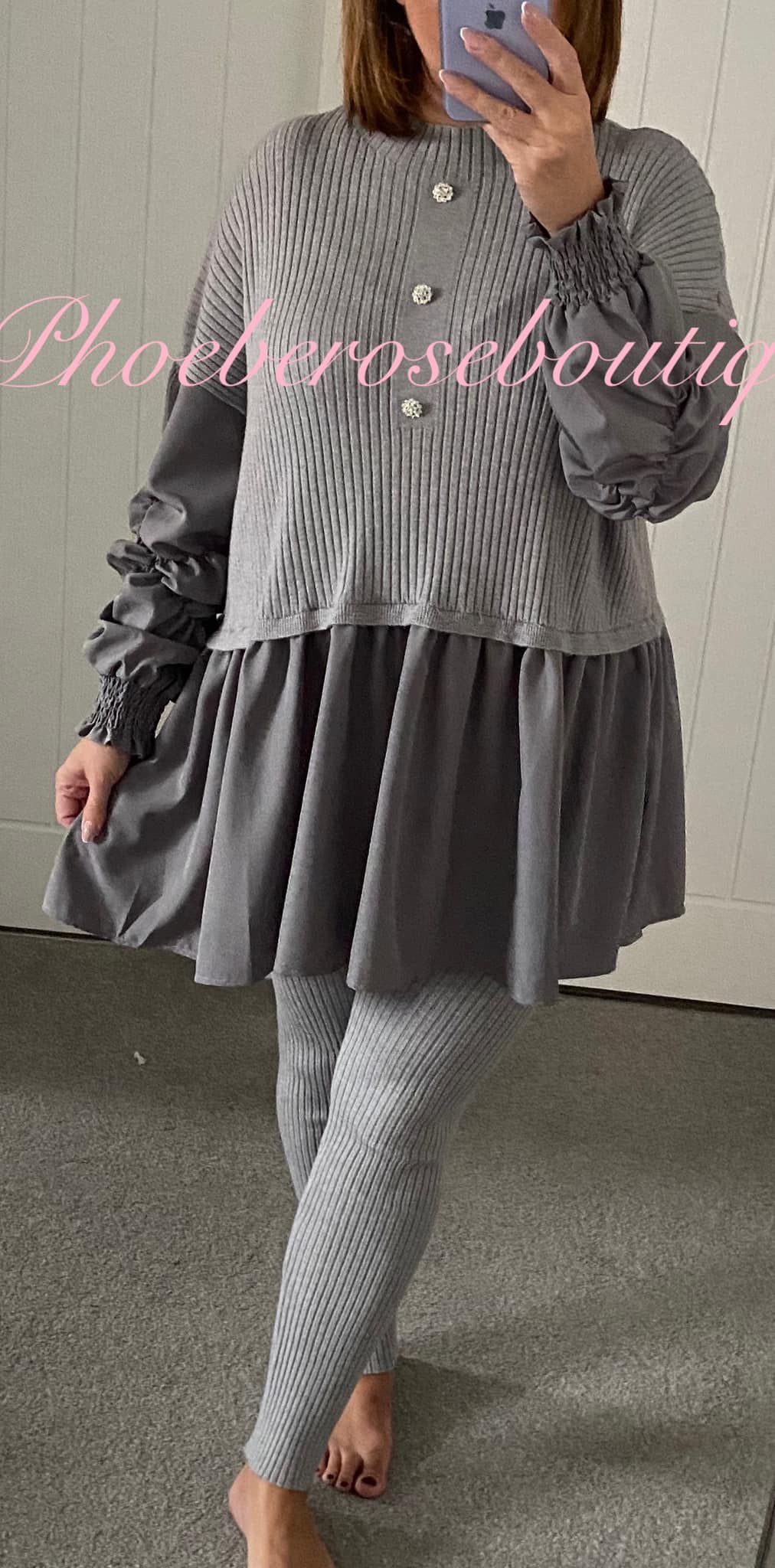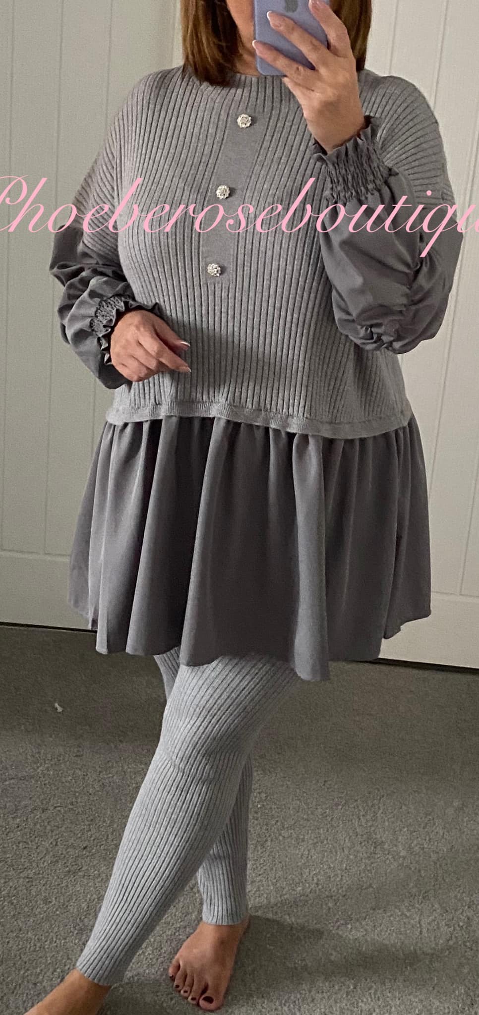 Satin Frill Soft Knit Ribbed Diamante Button Lounge-Suit – Soft Grey
