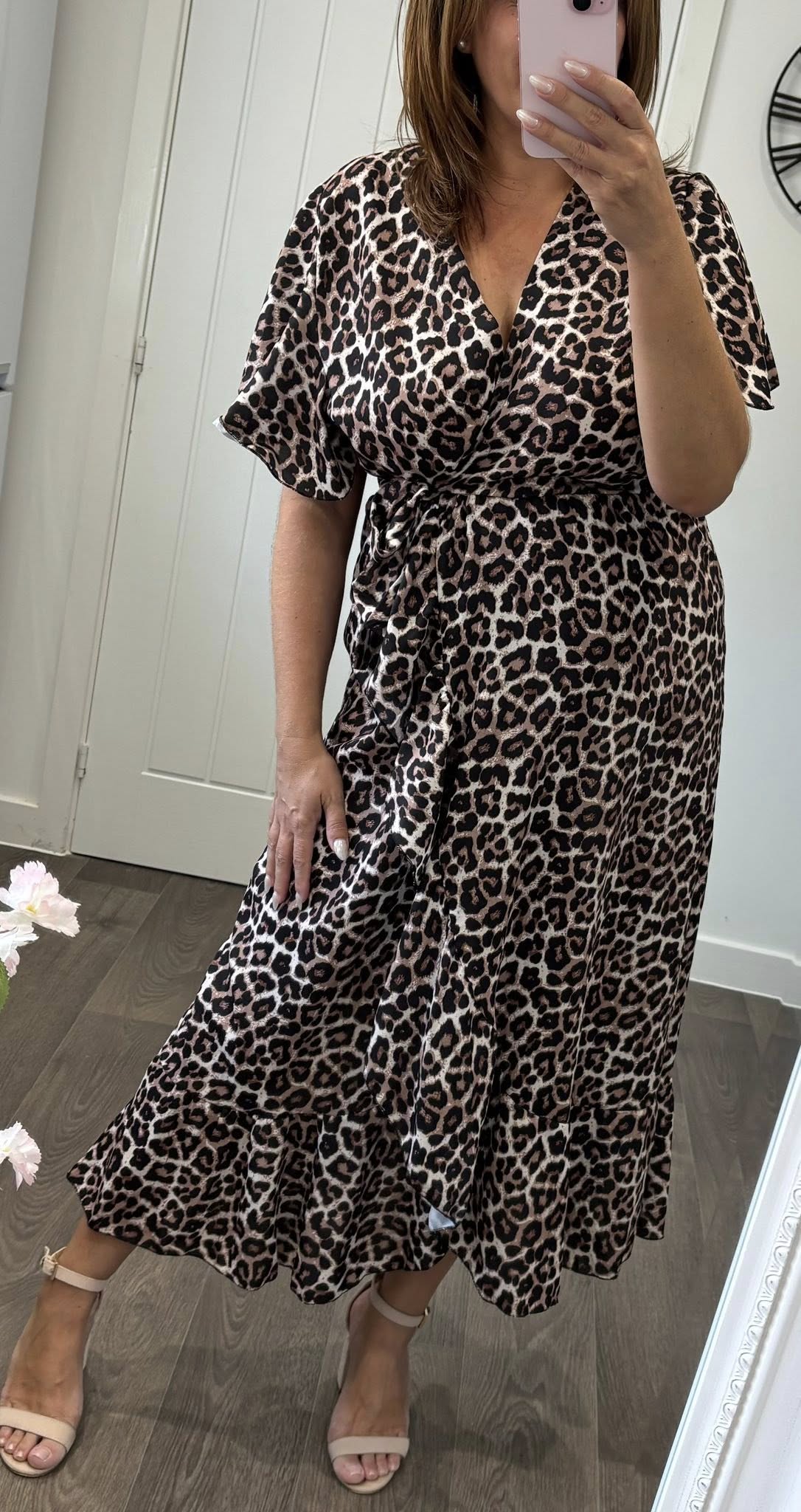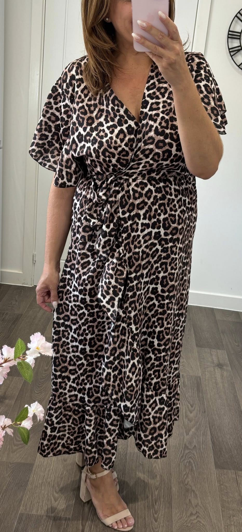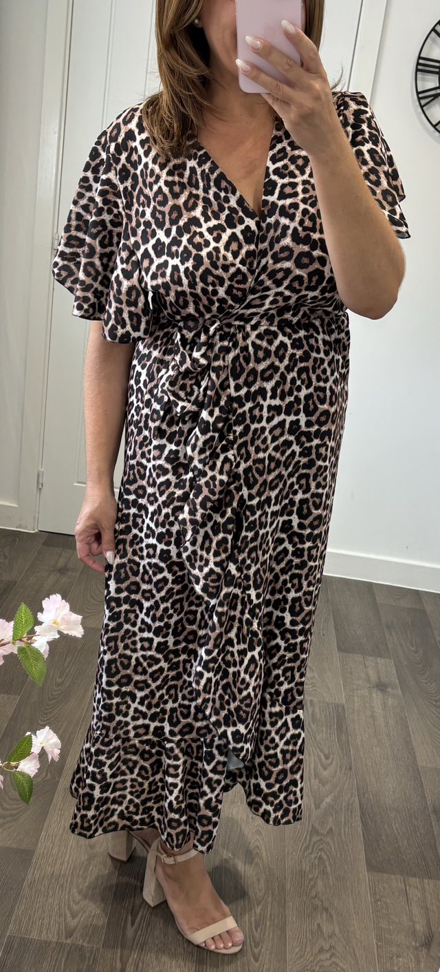 Simply stunning dress – Cross over front elasticated waist dress with tie side detail – Wrap effect skirt with frill edge, fluted style sleeves and midi length – One size fits up to a 16