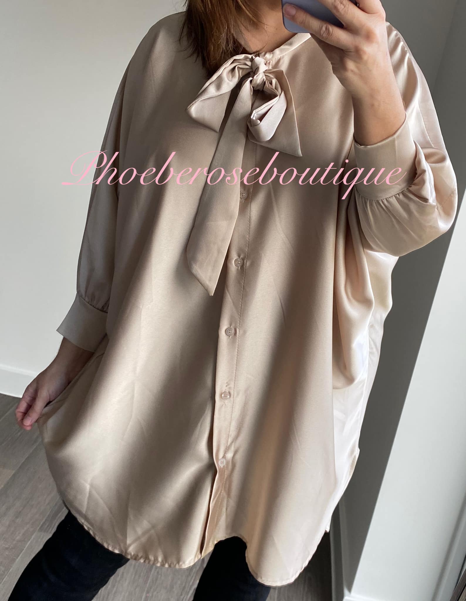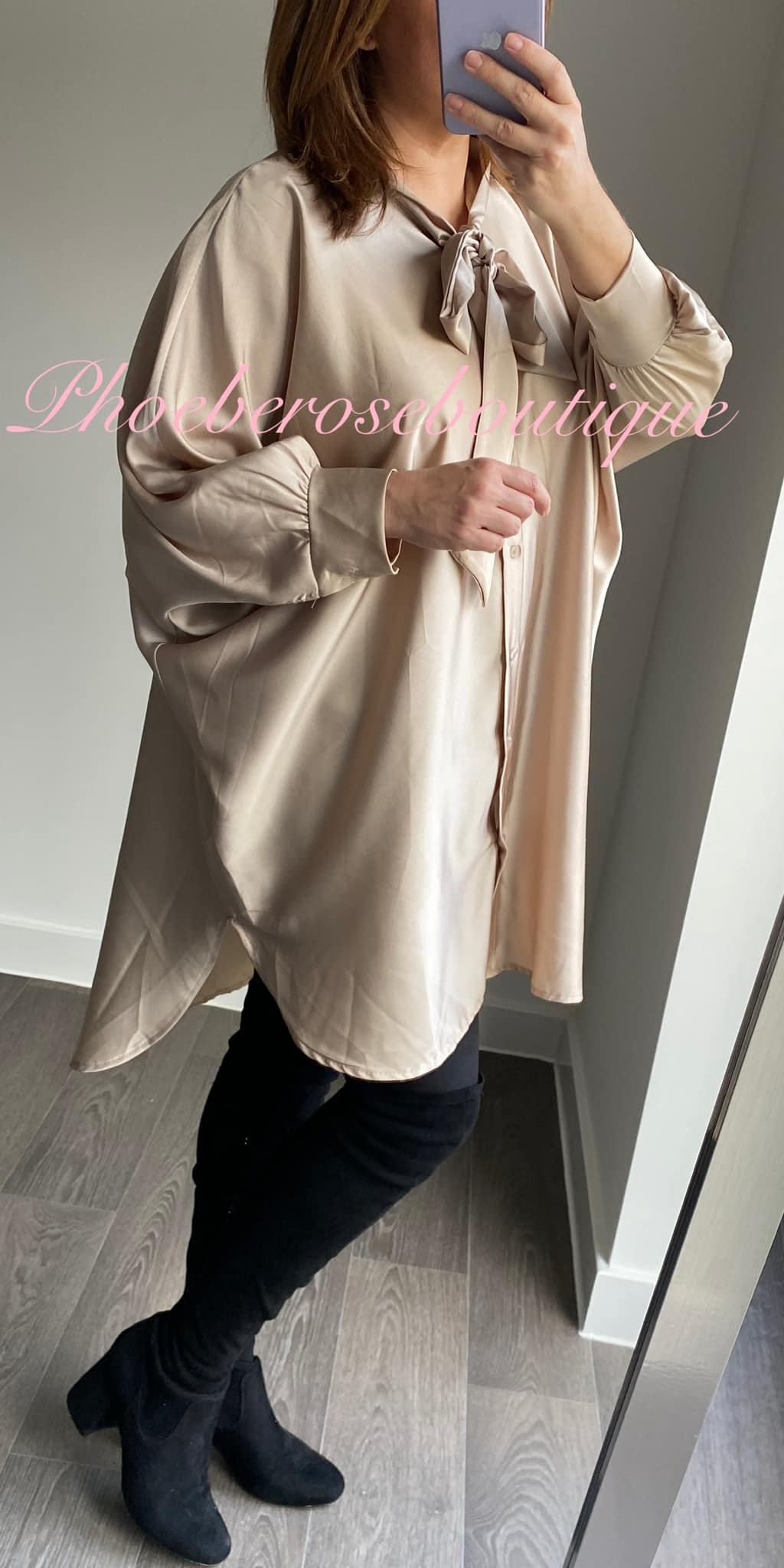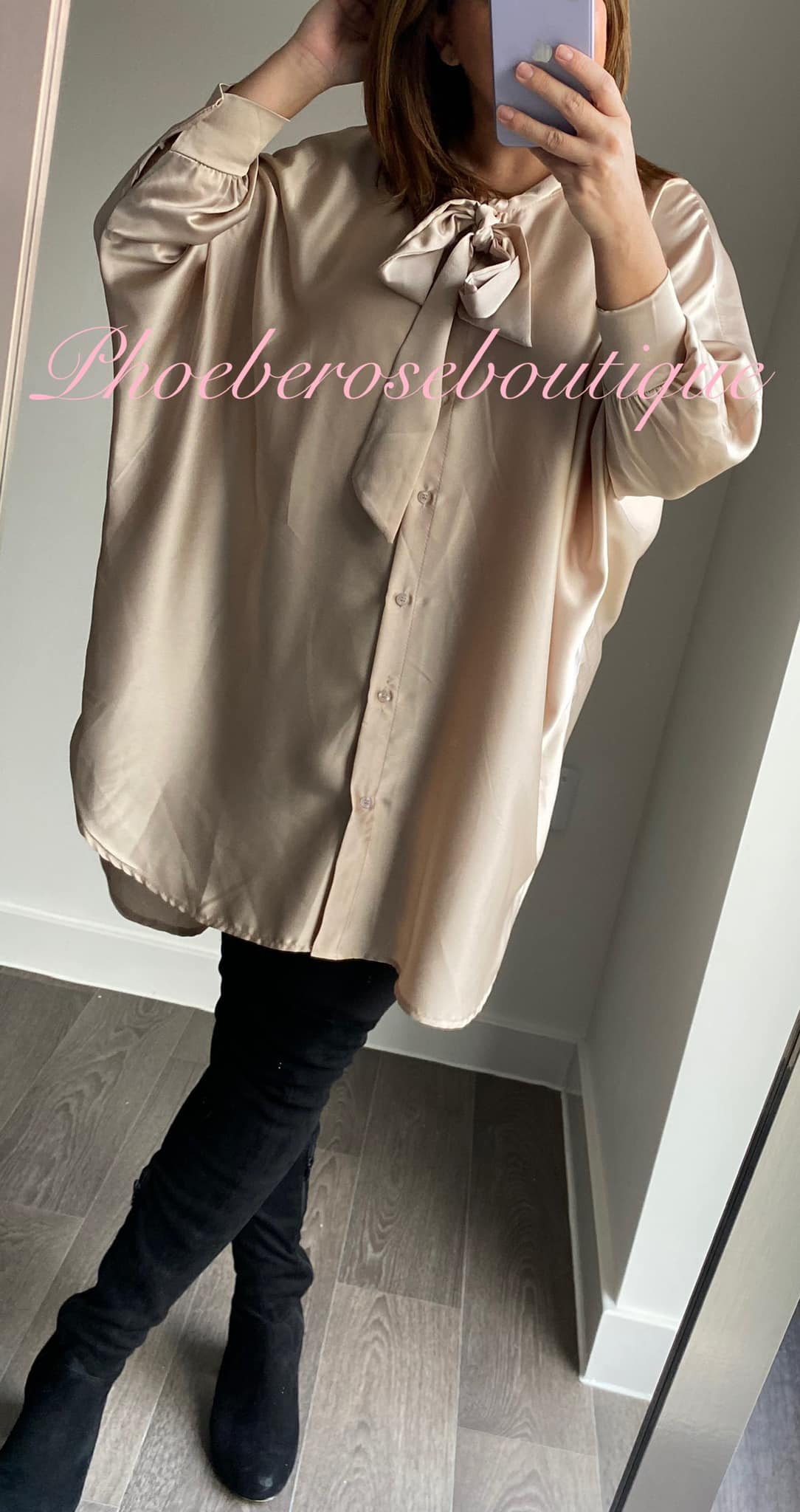 Satin Loose Fit Oversized Pussy Bow Shirt – Champagne