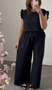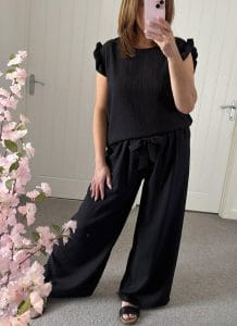 Gorgeous 2 piece suit – Wide leg elasticated waist trousers with tie belt and loose fit tunic style top with frill trim on sleeves – One size fits up to a 16 Just £26.99!!