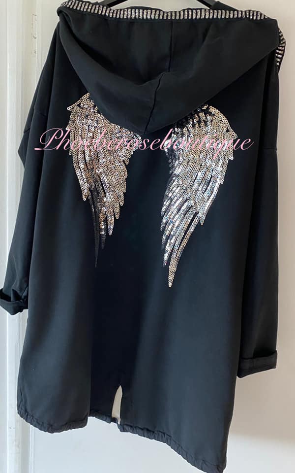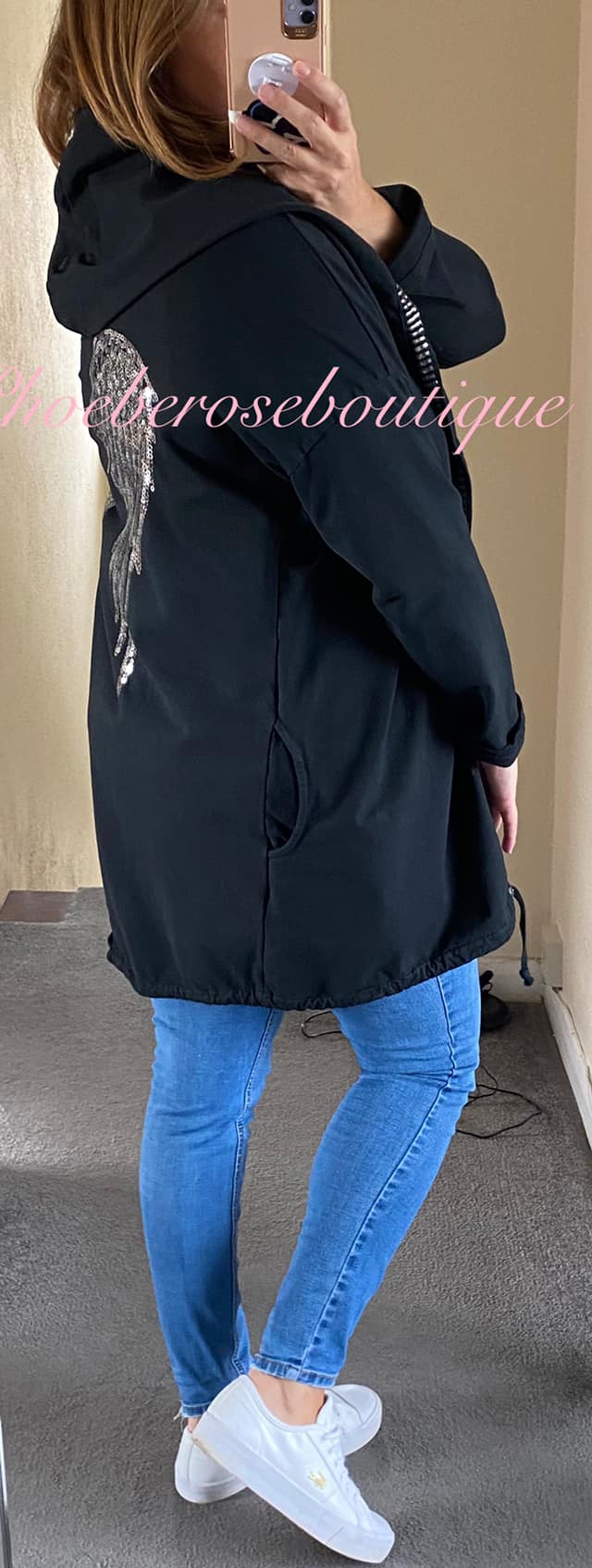 Sequin Angel Wings Back Lux Hooded Jacket – Black