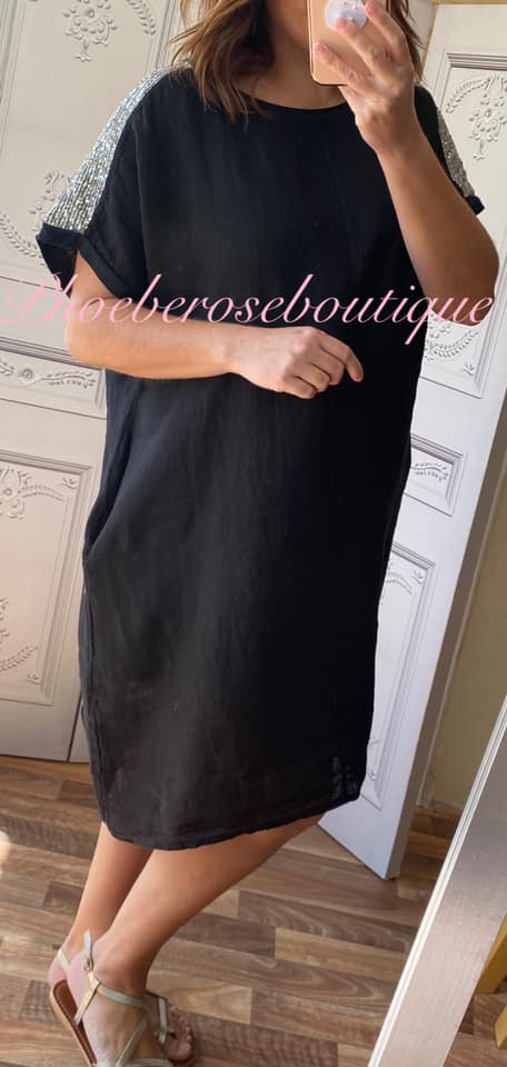 Sequin Shoulder Loose Fit Linen Pocket Dress – Black