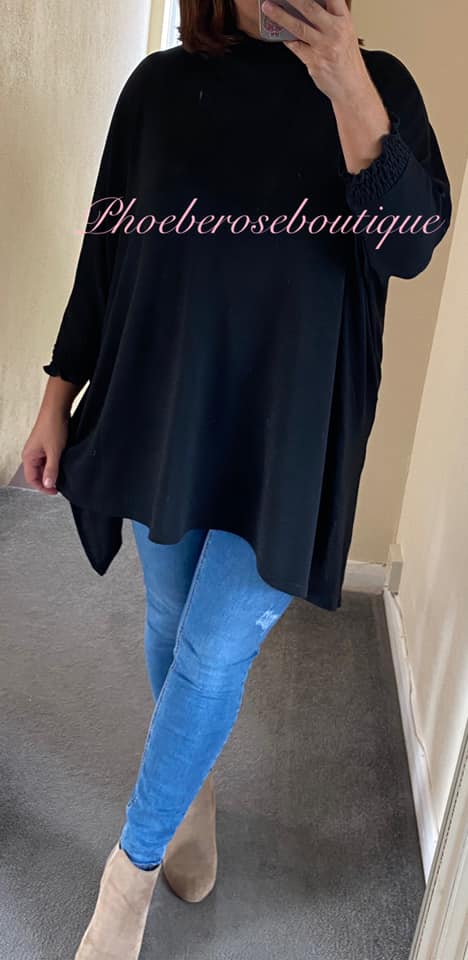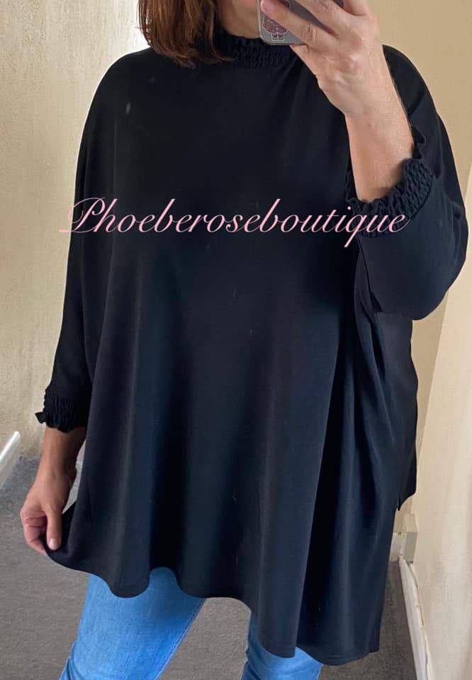 Shirred High Neck and Cuff Fine-knit Jersey Asymmetric Top – Black
