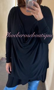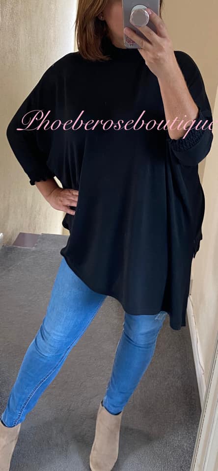 Be the first to review “Shirred High Neck and Cuff Fine-knit Jersey Asymmetric Top – Black”