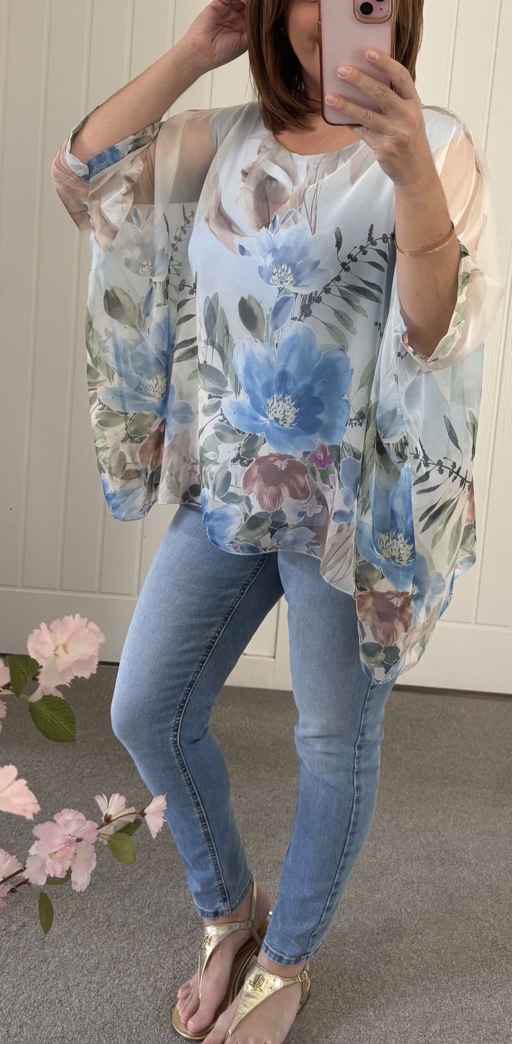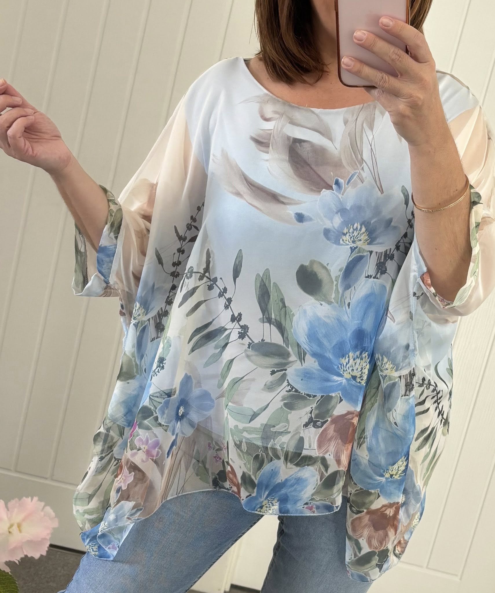 Gorgeous silk look chiffon batwing top with stretch jersey vest style lining – So comfy to wear – Easy jeans and a nice top! One size fits up to a good 16